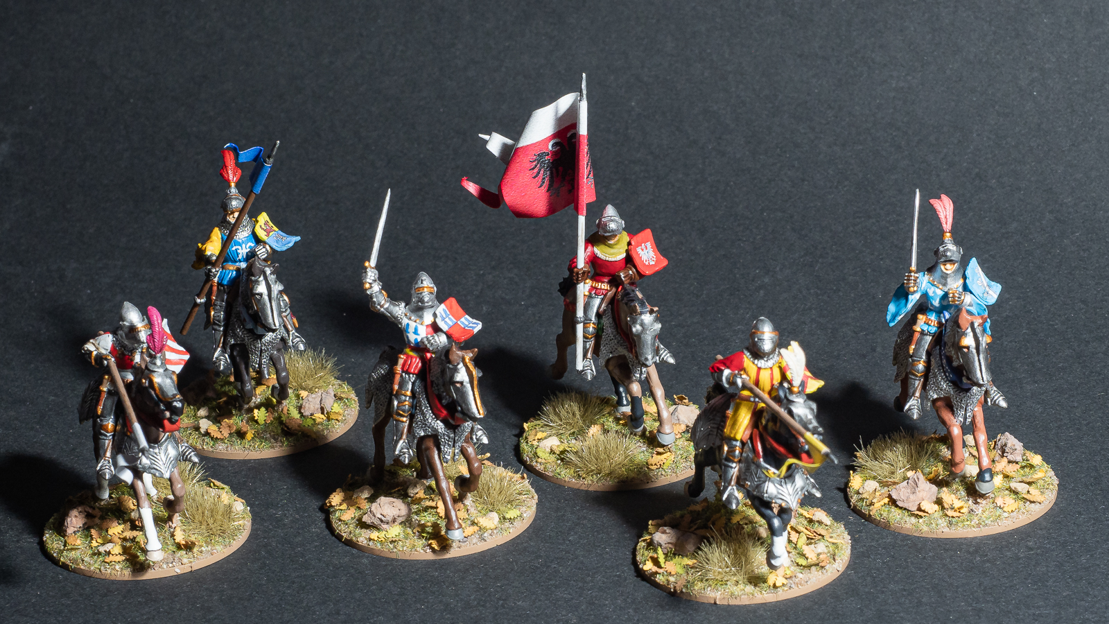 Heavy Cavalry - Frankfurter Patrizier, mit der Stadtfahne (weißer Adler). Ganz links ein Mitglied der Familie Frosch, vorne links ein Holzhausener, ganz rechts einer aus der Familie Glauburg.