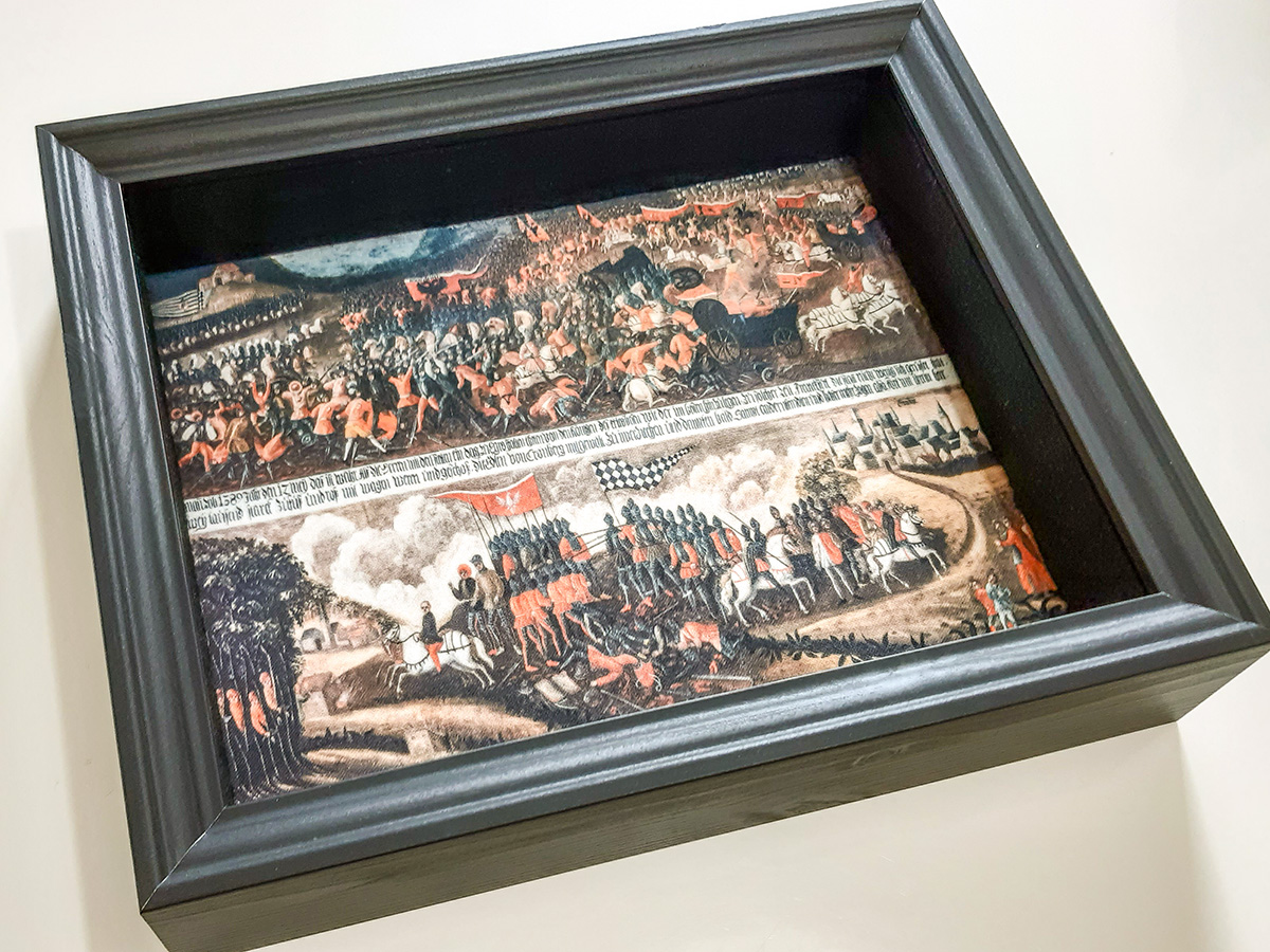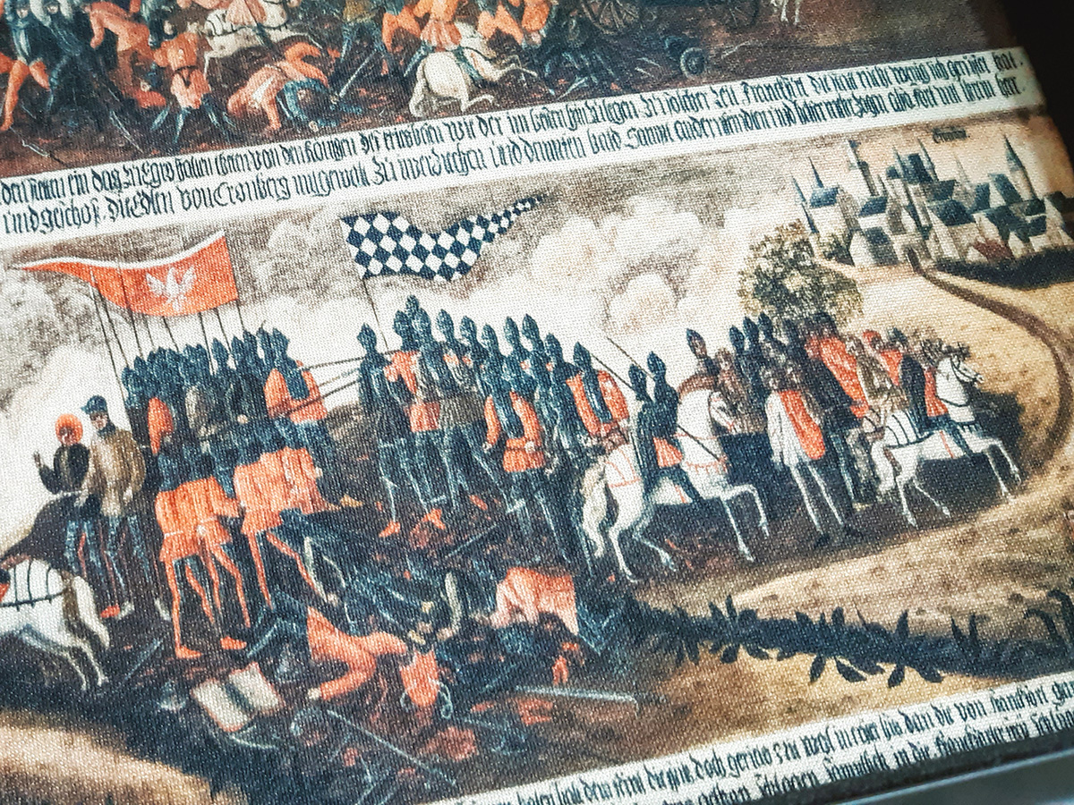 Eine schöne Ergänzung zu meiner Frankfurter Truppe: Ein selbstgebautes Würfelbrett mit dem Gemälde von der Schlacht von Eschborn (1389). Bestehend aus einem IKEA-Bilderrahmen (Västanhed, 20 x 25 cm), einem von wir-machen-druck.de bedrucktem Mousepad und Filz in der Stärke von 1 mm für die Innenränder :)