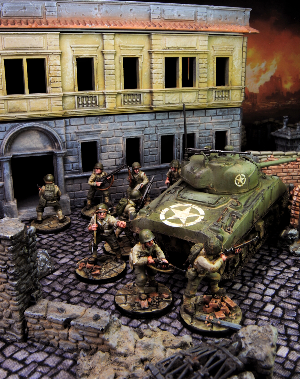 Historisch habe ich mich an die 34th US Infantry Division "Red Bull" gehalten. Bereits 1942 in Nordafrika eingesetzt, hat sie sich aber ihre Sporen in Italien verdient. In der 1.Monte Cassino-Schlacht überwandt sie den Gari und kämpfte sehr verlustreich in Cassino-Stadt und den angrenzenden Hängen bis sie ausgeblutet aus der Front genommen werden musste. Nach Cassino und der Auffrischung kämpfte sie bei Anzio und erfolgreich in Norditalien. Sie war maßgeblich an der Eroberung von Bologna beteiligt.