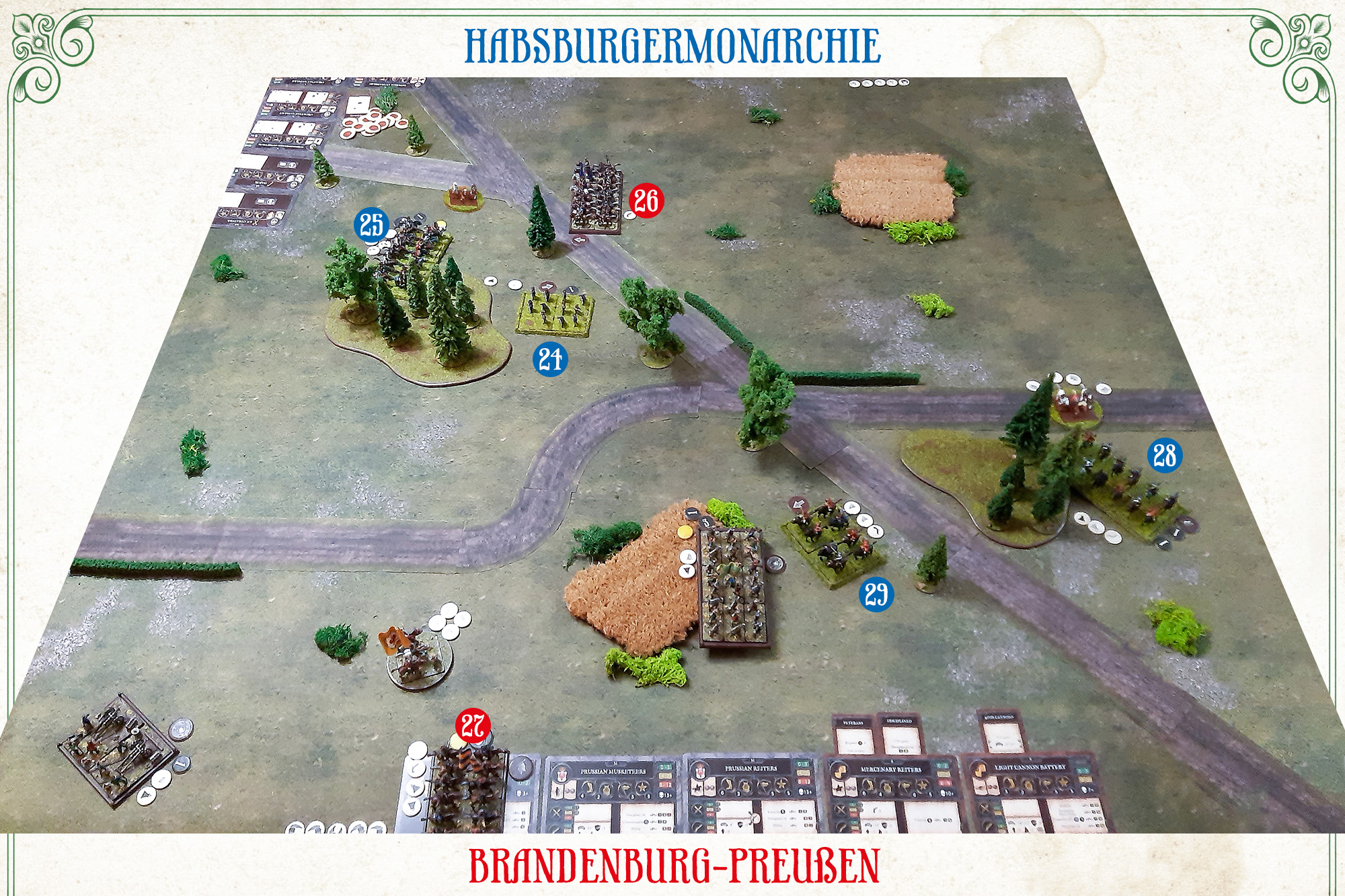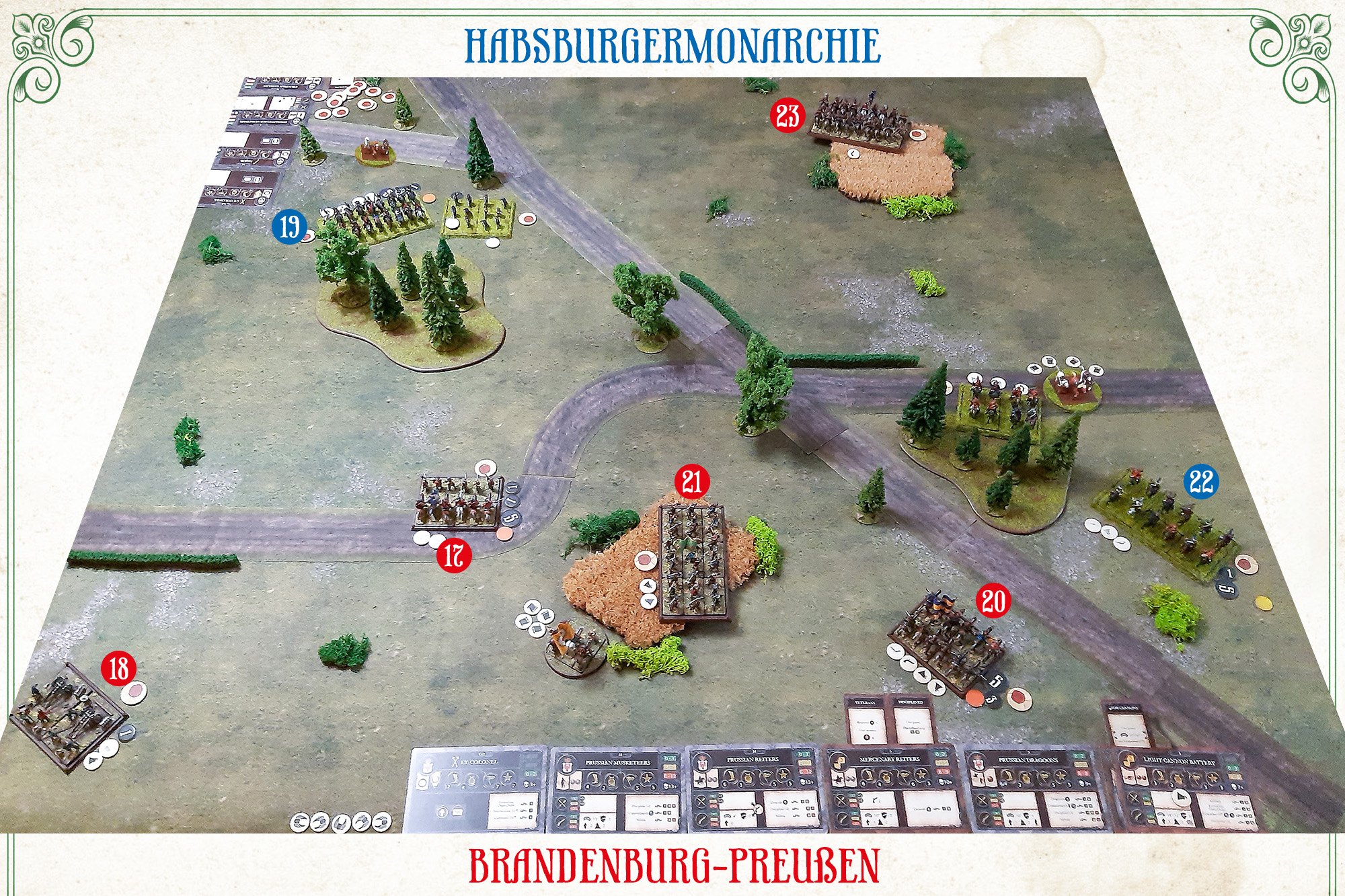 In der Mitte, inmitten eines reiffenden Kornfeldes, standen die Preußischen Musquetierer (1), wol exerciret und von trefflicher Feuerkraft; zu deren linker Hand aber waren die Dragoner (2) abgesessen und bereits tapffer vorgestoßen [Anm.: Die Szenarioregeln erlaubten der roten Seite, eine Einheit unmittelbar nach deren Aufstellung zu bewegen], gleich im Begriff, den vor ihnen liegenden Wald zu besetzen. Etwas rückwärts, mehr nach Außen, hielt sich die Cavallerie (3), noch unschlüssig, ob sie linker oder rechter Hand durch das Gehölz zu schlagen gedächte; und unter einer nützlichen Schrägstellung im Rücken derselben nahm die Vier-Pfünder Batterie (4) Aufstellung, mit einem weiten freyen Schuß-Feld vor sich. Zur rechten Flancke aber hielt in einem anderen Wald die Söldner-Cavallerie (5) Wacht. Der Obrist Lieutenant (6) mit seinem kleinen Stab verblieb anfangs im Felde bey den Musquetierern, damit er das gantze Treffen wohl übersehen und die Befehle nach Noth ertheilen möge; seine Ordonnanz lautete, daß die Unserigen defensiv, doch wohlbedacht und mit Vorsicht gehandelt sollen.