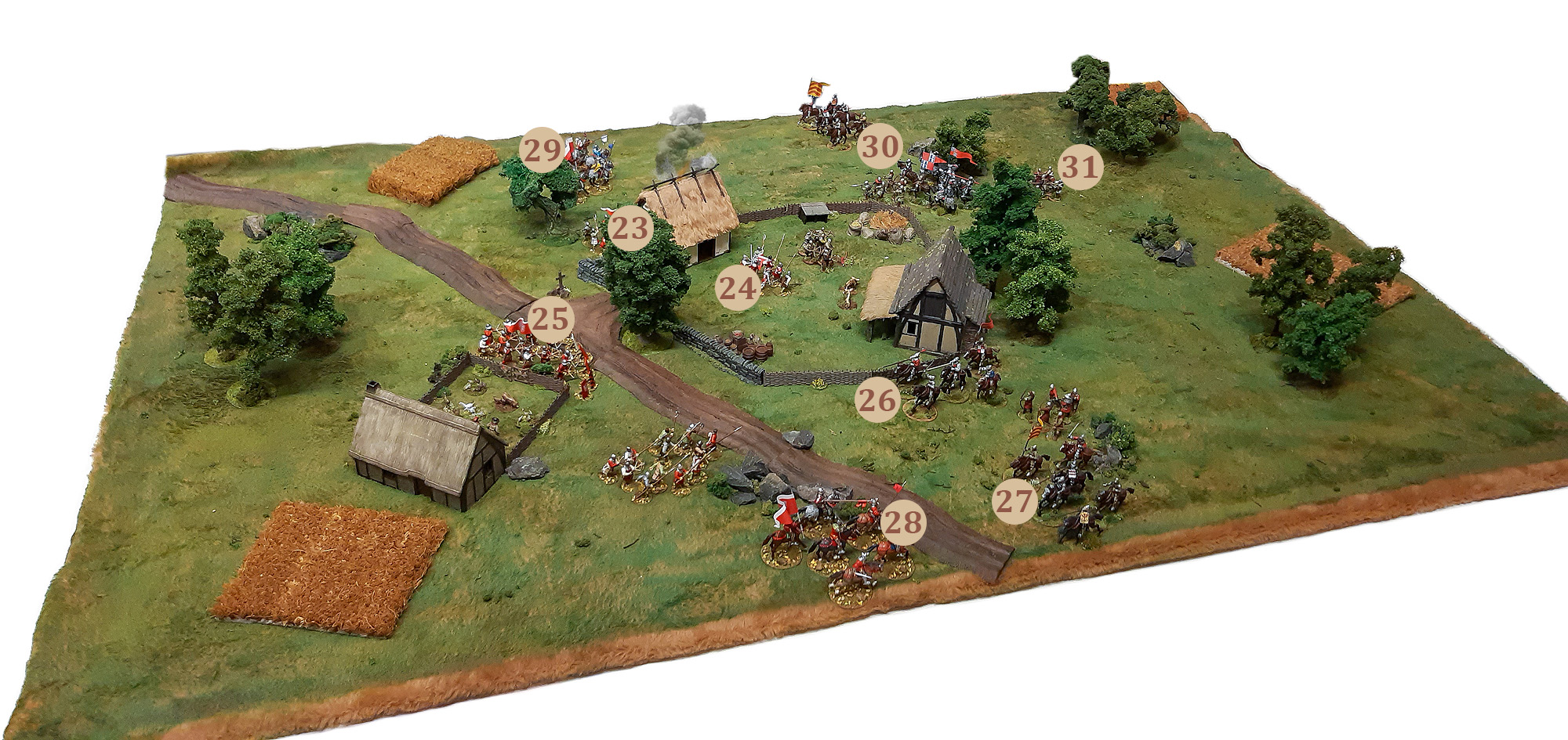 Zigors Hanauer Truppe rückte von Osten heran; sie bestand aus Reisigen (7) (Heavy Cavalry), Plänklern mit Büchsen (8) (Skirmishers), Armbrustschützen (9) (Crossbowmen), schwer gepanzerten Berittenen aus dem verbündeten Kronberg (10) (Elite Cavalry) sowie leichter gerüsteten Berittenen aus Kronberg (11) (Heavy Cavalry), weiteren Plänklern (12) (Skirmishers) sowie Kronberger Reisige (13) (Heavy Cavalry). In dem zentralen Gehöft, in Deckung hinter der umgrenzenden Steinmauer, hatten die Hanauer einen weiteren Trupp Armbrustschützen (14) (Crossbowmen) wirksam positioniert, um die Frankfurter schon beim Näherkommen attackieren zu können (dies erlaubt das Szenario "Sausages with Mustards" ausdrücklich für den Verteidiger).