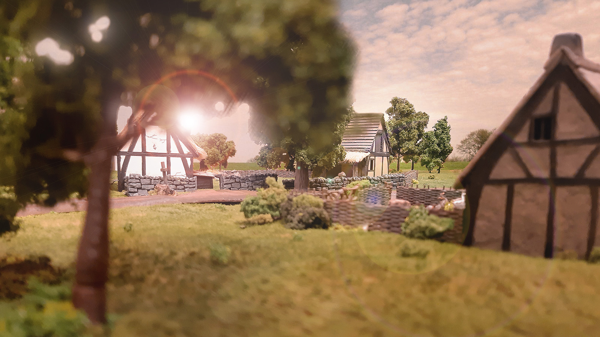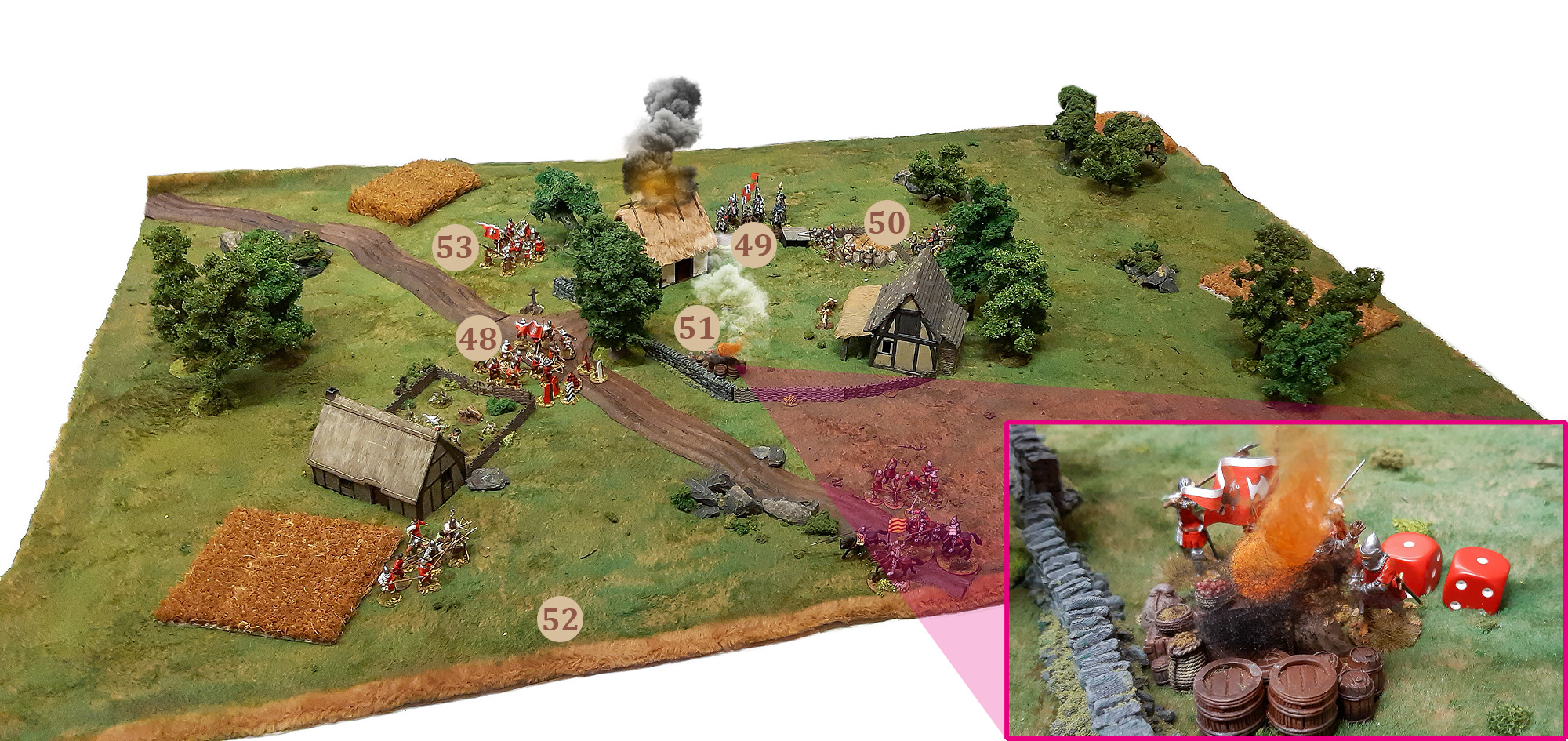 Aus diesem Grund nun brachen die Frankfurter im Herbst 1388 abermals ins Hanauer Land auf. Wie es einer Fehde entspricht, wollten sie den Gegner zwingen, ihre Ansprüche anzuerkennen und Wiedergutmachung zu leisten - durch spürbaren Schaden im Herrschaftsgebiet, etwa durch Plünderung und Brandlegung. Zigor und ich wählten dafür das in jeder Hinsicht passende Lion-Rampant-Szenario "Sausages with Mustards": Der Angreifer soll vier zentrale, im Quadrat angeordnete Ziele in Brand setzen, indem er mit Einheiten Kontakt herstellt und per Wurf klärt, ob das Feuer greift. Brennen alle vier Ziele, gewinnen die Frankfurter; verlieren sie hingegen mehr als die Hälfte ihres Einheitenpunktswertes, sind sie geschlagen.