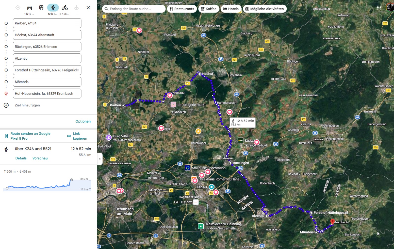 Bzgl der Route finde ich die realen Entfernungen ganz hilfreich