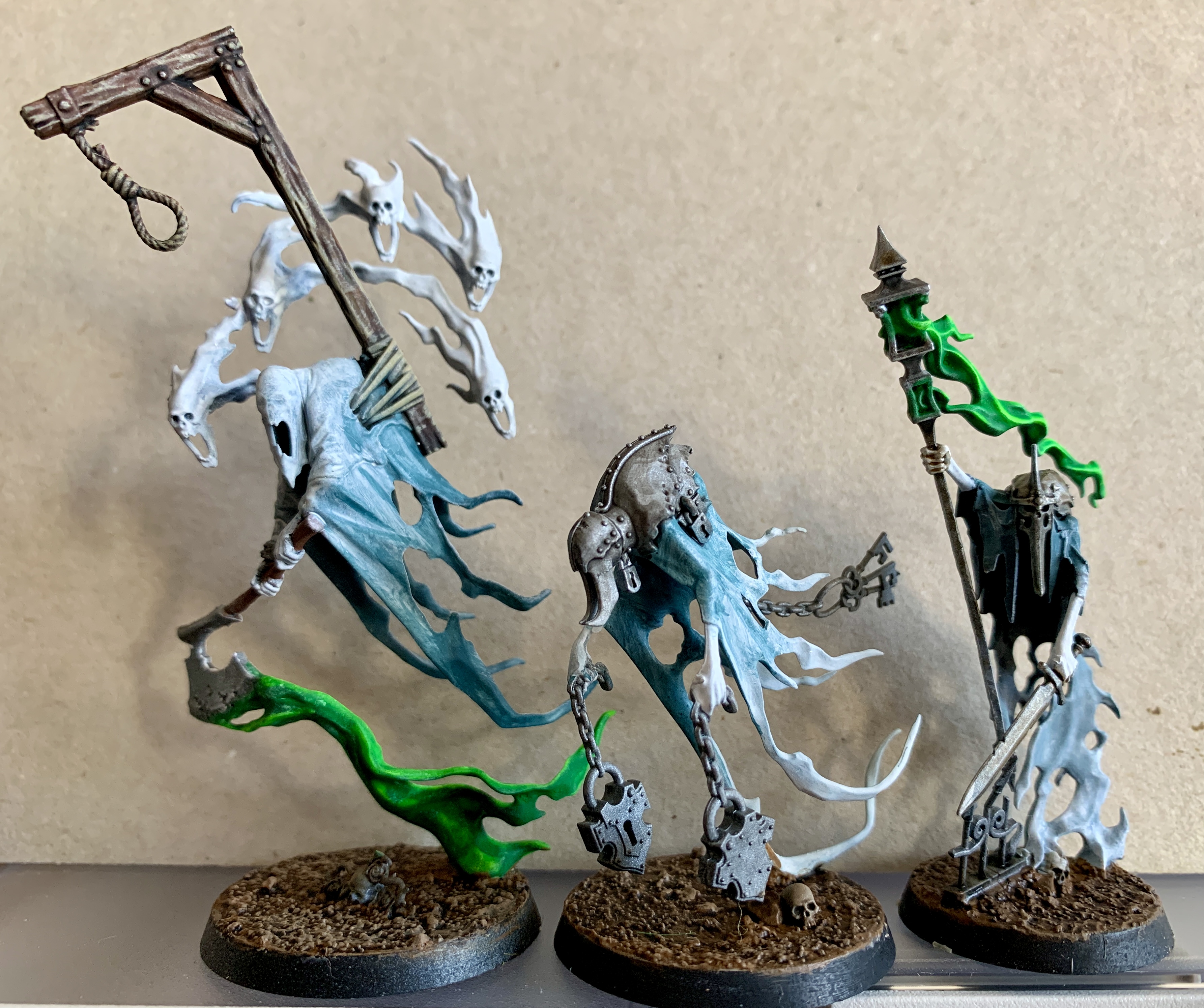 Zur Abwechslung mal AoS - Nighthaunt. Ganz andere Malerei, da muss ich mich erst mal an die Figuren "heran tasten", mal sehen, ob das mit mir un dGW in diesem Leben noch mal etwas wird. Die Nighthaunt sind einige der wenigen Miniaturen von GW, die mir gefallen.