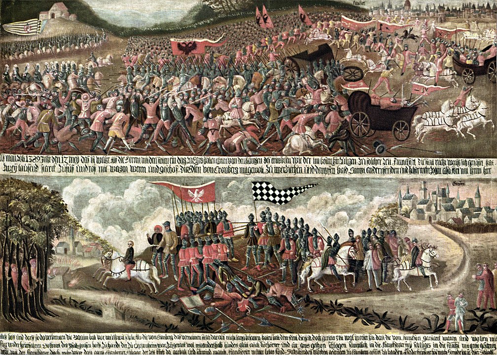 Wie man also sieht, befinden wir uns Ende des 14./Anfang des 15. Jahrhunderts in einer etwas chaotischen Umbruchszeit, weshalb es schwierig ist, klare Aussagen über die konkrete Gestaltung der von Frankfurt verwendeten Wappen/Fahnen in einem bestimmten Jahr zu treffen :crazy Die früheste Version des Gemäldes von der Schlacht von Eschborn dürfte einige Jahrzehnte nach der Schlacht, vielleicht um 1420 entstanden sein. Da dies angesichts der dürftigen Quellenlage die einzige Abbildung ist, die ein komplettes Heer unter Fahnen zeigt, bietet es sich an, sich daran zu orientieren. Eine gewisse künstlerische Freiheit ist dem Maler des Gemäldes natürlich zuzugestehen, aber das gilt ja ebenso für uns Figurenmaler ;) Ich vermute aber, dass die Darstellung auf den Gemälden auch nicht allzu weit von der Realität entfernt sein wird, da es sonst für die Zeitgenossen unglaubwürdig wäre (eines der Gemälde hing/hängt ja in der Burg Kronberg und somit unmittelbar am Sitz einer der beteiligten Kriegsparteien), wenngleich wiederum in mittelalterlichen Darstellungen allgemein eher Symbolik vor Realität ging...