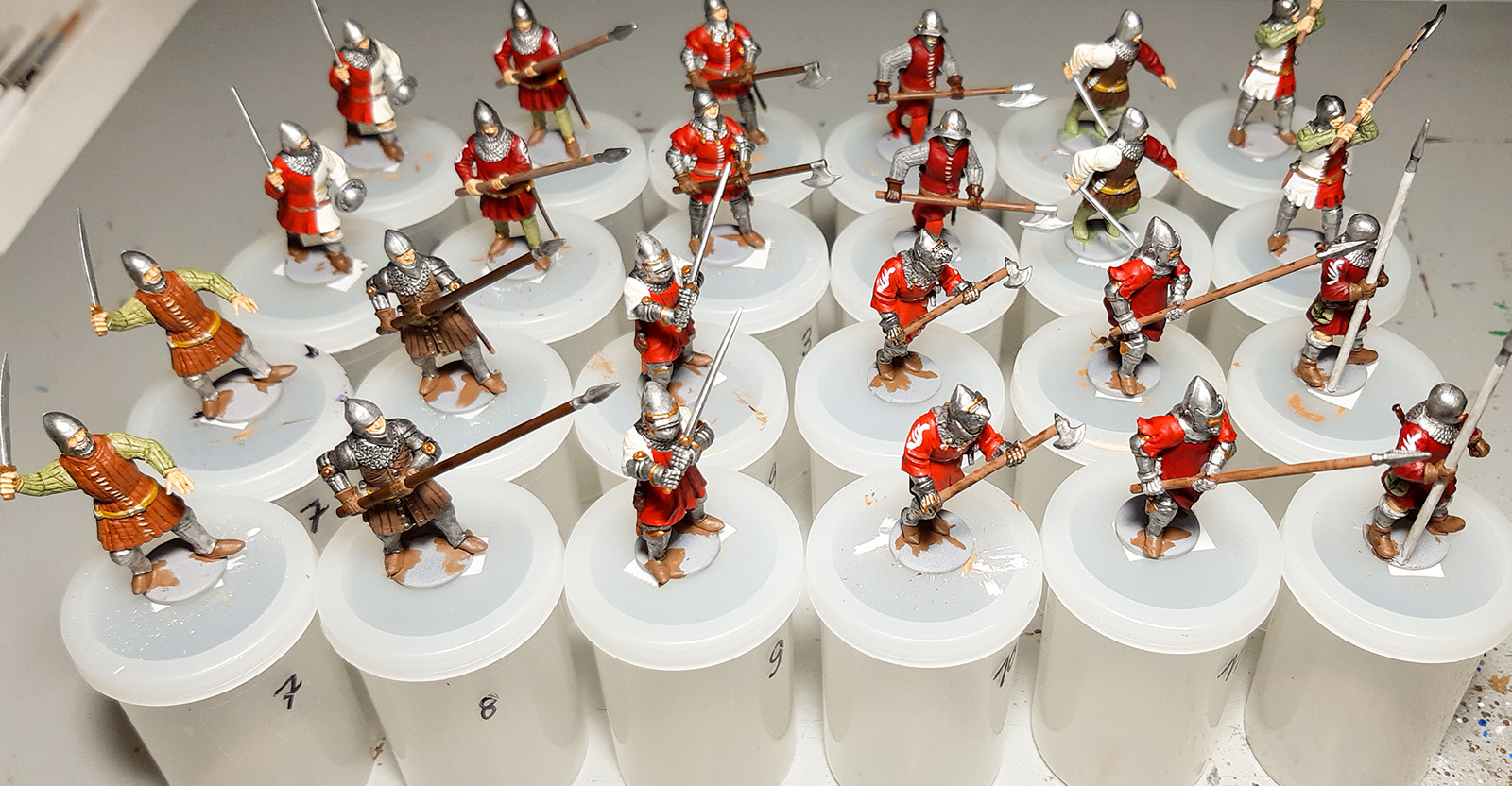 Die zwei Einheiten Heavy Infantry sind bis auf Lackieren und Basieren fertig. (Sowohl Lackieren als auch Basieren erledige ich in einem Rutsch, wenn alle Figuren bemalt sind.)
