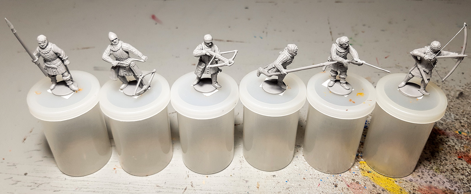 Als nächstes folgt die Einheit Skirmisher. Das sind nur sechs Figuren, also vergleichsweise entspannend 8-) Der Bogenschütze ganz rechts wird rot-weiß, zwei weitere Figuren bekommen rote bzw. rot-weiße Ärmel, ansonsten werden Braun-/Beigetöne dominieren.