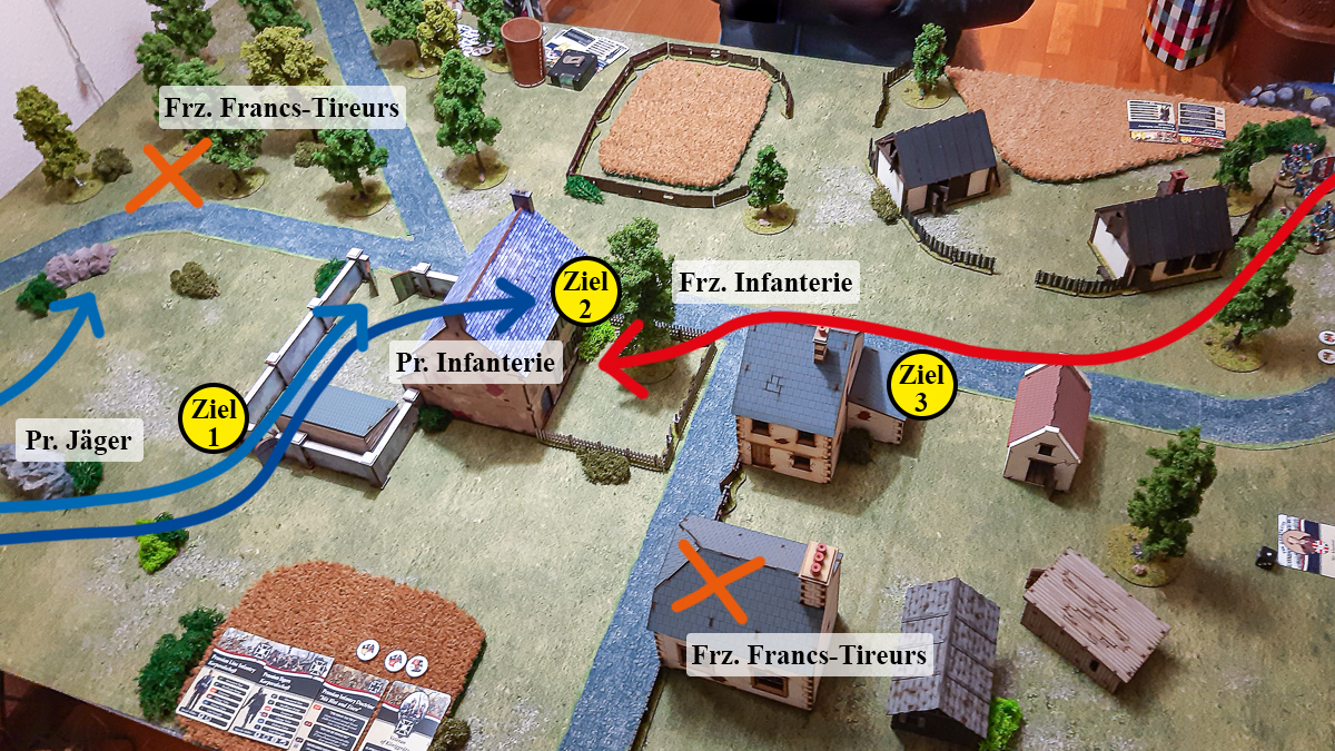 Die Preußen haben mehrmals ihre spezielle Doktrin "Preußische Taktik" ausgespielt, die ihnen eine doppelte Bewegung ermöglicht. So gelang es ihnen mit zwei Trupps Linieninfanterie, das ihrer Aufmarschzone nächstgelegene Ziel an der Mauerecke rasch zu erreichen und auch das mittlere Ziel in dem großen zentralen Gebäude vor den langsameren Franzosen einzunehmen. Diese beiden Trupps haben sich daraufhin in dem Gebäude verschanzt. Die Franzosen nahmen mit ihren zwei Trupps Linieninfanterie das ihnen am nächsten gelegene Ziel an der Kante eines kleinen Gebäudes ein und stießen dann unter Feuergefechten in Richtung des Gebäudes, in dem die Preußen saßen, vor. Insgesamt konnten die Franzosen ihren großen Vorteil gegenüber den Preußen, nämlich die längere Reichweite ihrer Chassepot-Gewehre (die sie von Grund auf haben und für die sie keine Kommandopunkte ausgeben müssen), durch das dichte Gefechtsfeld nicht adäquat ausspielen. Sie haben als Verstärkung zwei Trupps Francs-Tireurs geholt, welche gegenüber allen anderen Truppentypen die besondere Fähigkeit haben, beliebig auf dem Gefechtsfeld auftauchen zu können, anstatt nur in der eigenen, schmalen Aufstellungszone an der Tischecke (sie müssen dabei lediglich einen Mindestabstand zu gegnerischen Truppen sowie Zielen einhalten). Die Preußen haben als Verstärkung zwei Jäger-Trupps beordert. Die Verstärkungen haben sich zwar, teilweise in leichter Deckung stehend, gegenseitig beschossen und dabei leichte Verluste hinnehmen müssen, hatten auf den Ausgang des Gefechts aber keinen signifikanten Einfluss. Später haben die Franzosen noch eine Mitrailleuse (Schnellfeuergeschütz) als Verstärkung gerufen, die aber aufgrund ihrer Langsamkeit nicht zum Einsatz kam (aber sie wollten sie wenigstens mal präsentieren). Zum Schluss hat die französische Linieninfanterie versucht, das zentrale Gebäude zu stürmen. Ihnen war aber kein Erfolg beschieden, und so ging der Sieg im Scharmützel an die Preußen, die zuvor ihre Kommandopunkte klug (im Nachhinein betrachtet - im Eifer des Gefechts eher durch Zufall bzw. Intuition) in eine ausreichende Anzahl Siegpunkte umgewandelt hatten. Rückblickend lässt sich sagen, dass der eher defensive Einsatz der Francs-Tireurs, die sich niemals von ihren Aufstellungspunkten am Waldrand bzw. dem kleinen Gebäude fortbewegten, den Franzosen wohl den Sieg genommen hat, denn dadurch mussten die Preußen, die ihrerseits stets gut gedeckt standen, zu keiner Zeit um ihr früh eingenommenes Ziel an der Mauerecke fürchten.