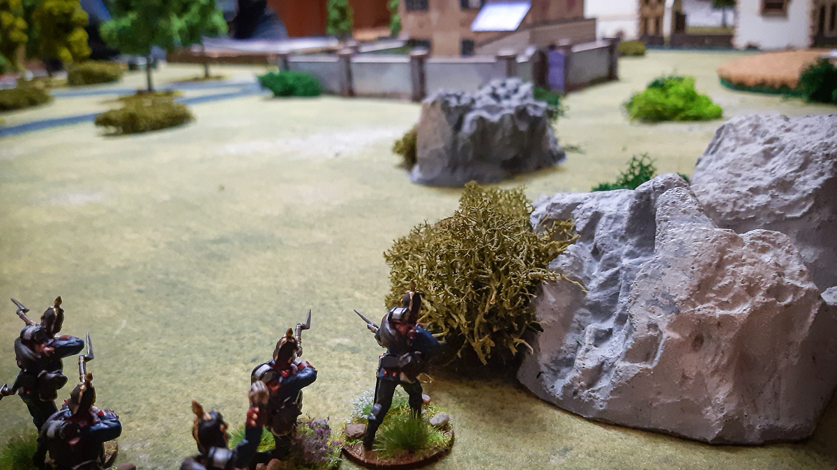 Hier stehen sie noch dicht vor dem Gebäude, während die Franzosen hinten langsam, aber stetig anrücken.
