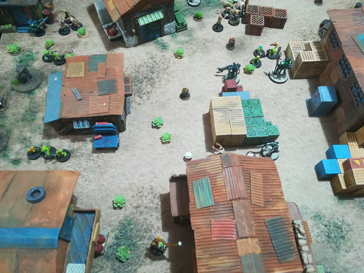 Grimdark Future: Firefight mit meinen Necrons gegen seine Orks in einer Orksiedlung.