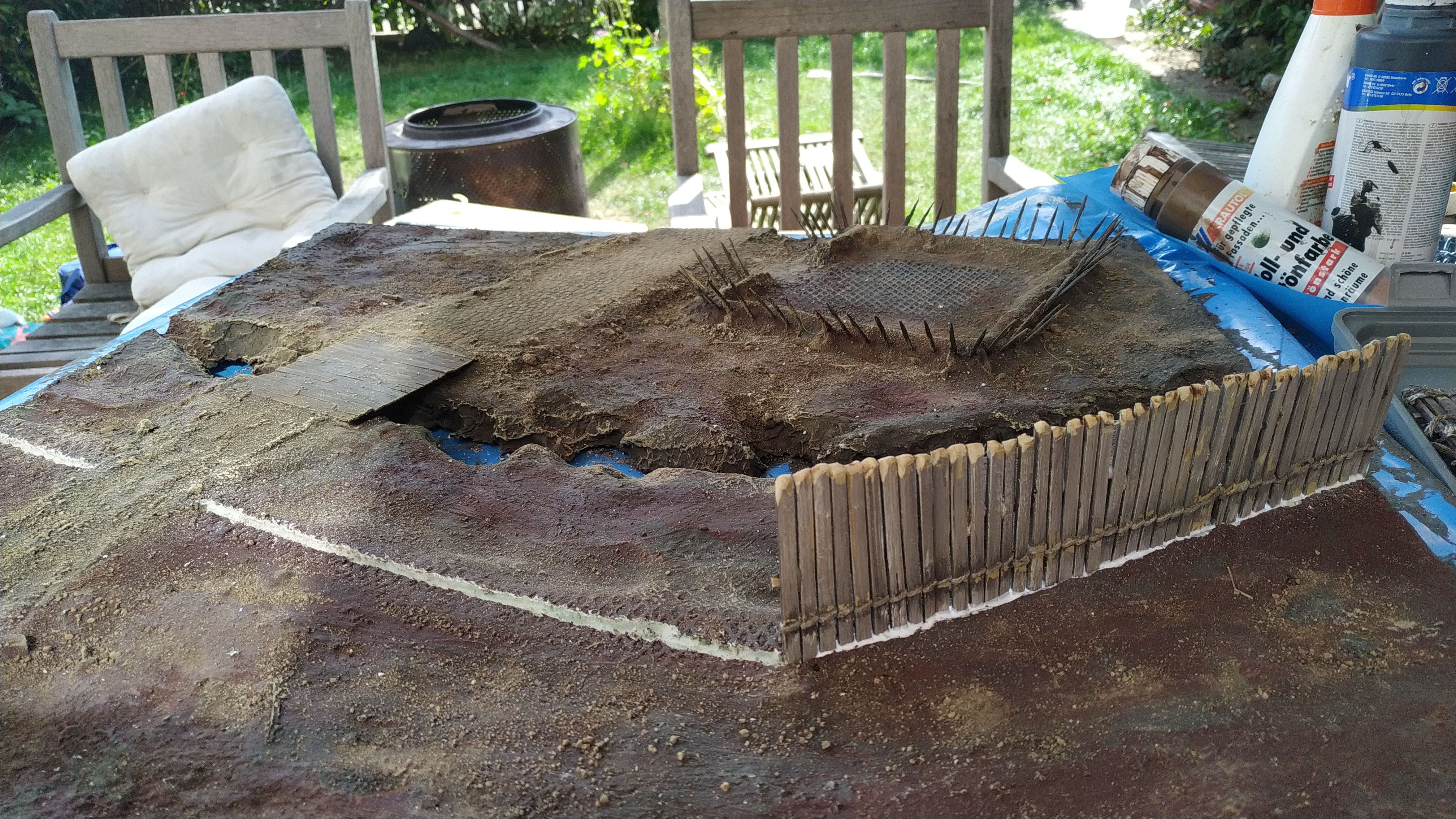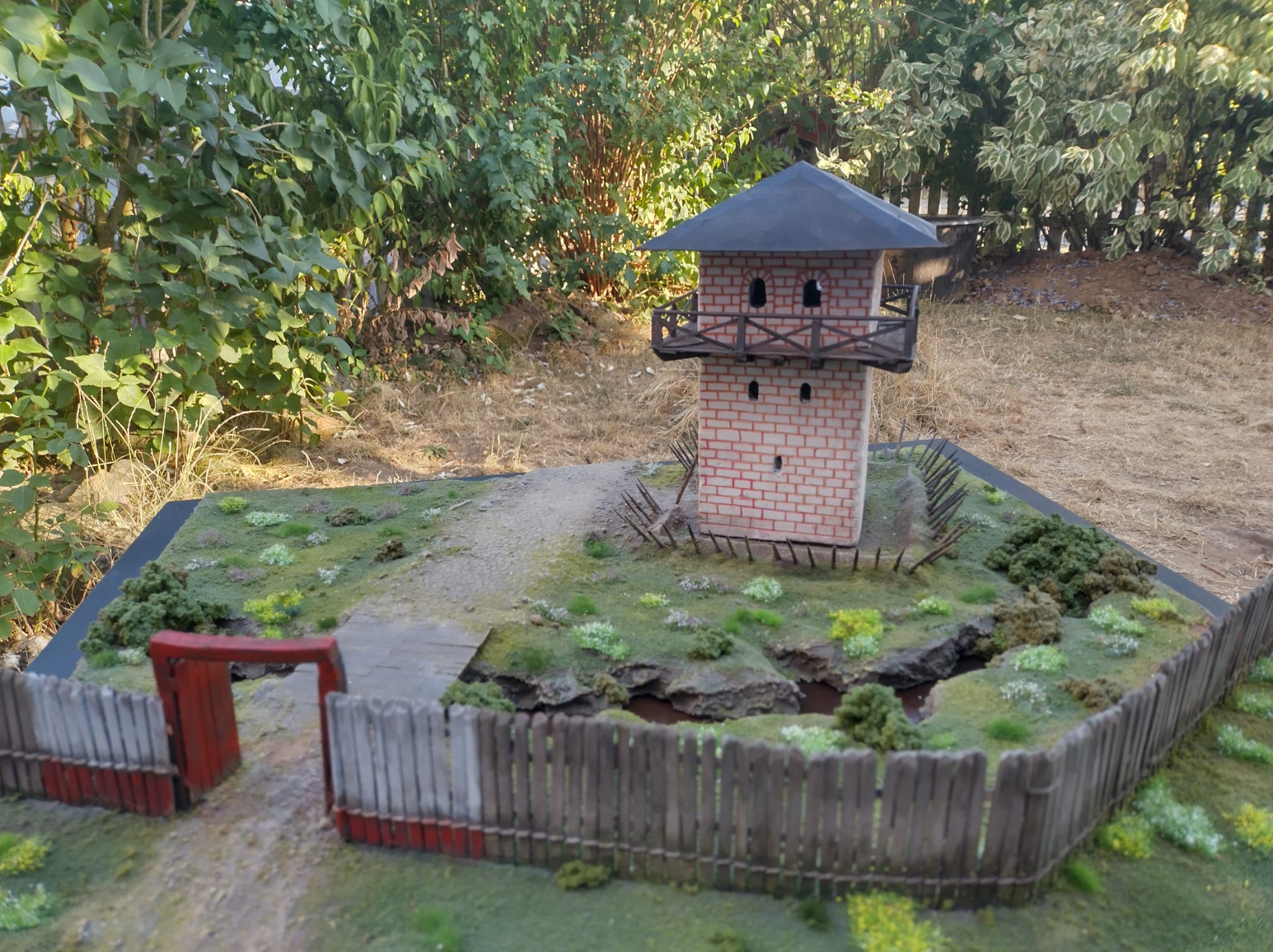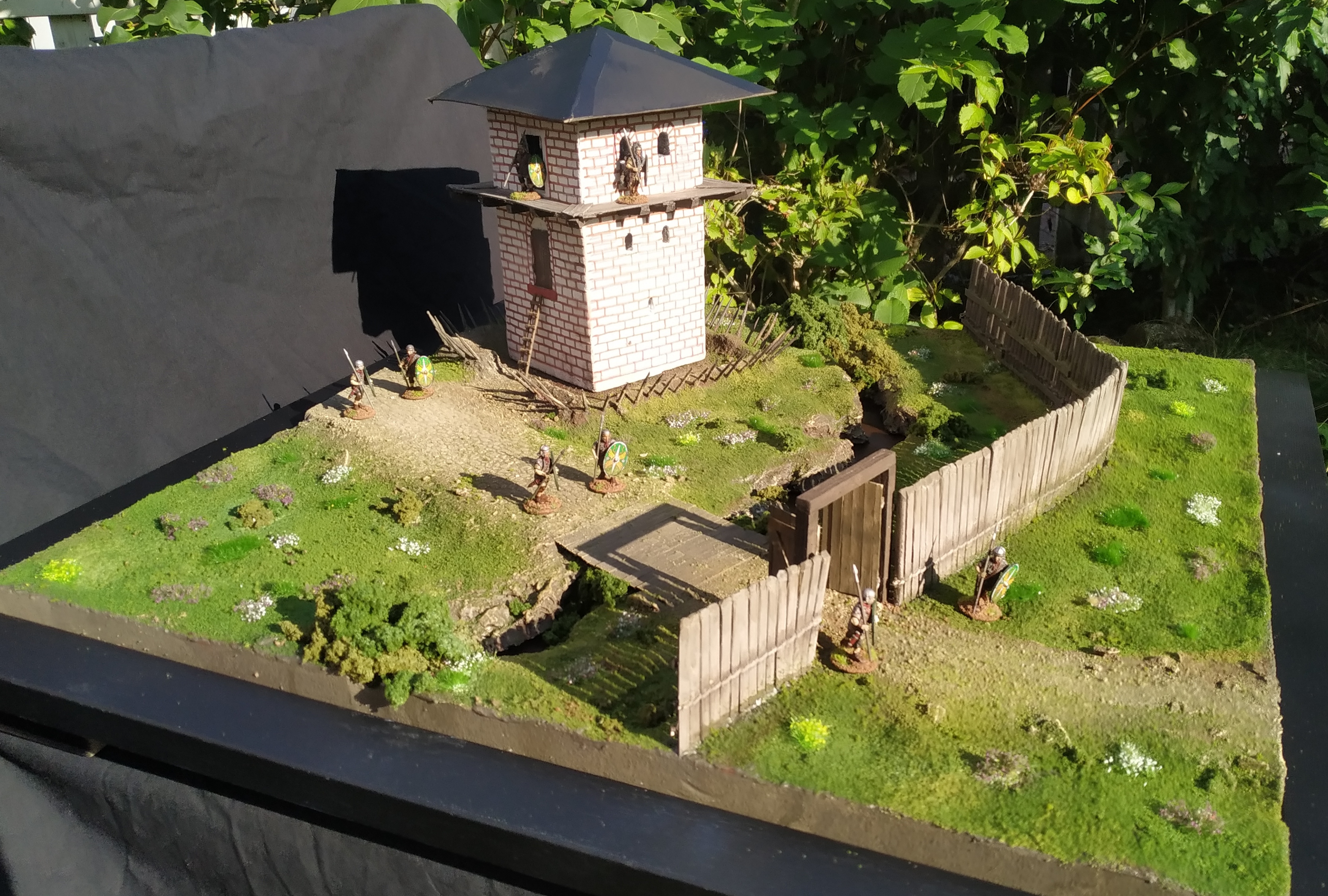 Nunja... Da ich morgen im Rahmen einer Römerwanderung für Kinder einen kleinen Vortrag am Limesturm in Rommelhausen halte, habe ich das Diorama Mal etwas entstaubt, das Geländer fertig gebaut und das Tor bemalt. Leider ist das Tor komplett verzogen und muss neu konstruiert werden... Aber für morgen sollte es ausreichend sein...