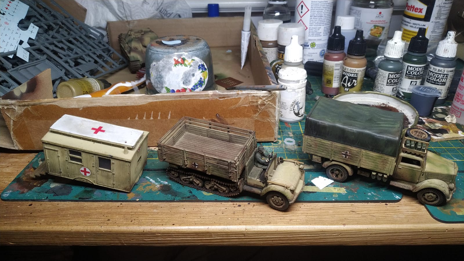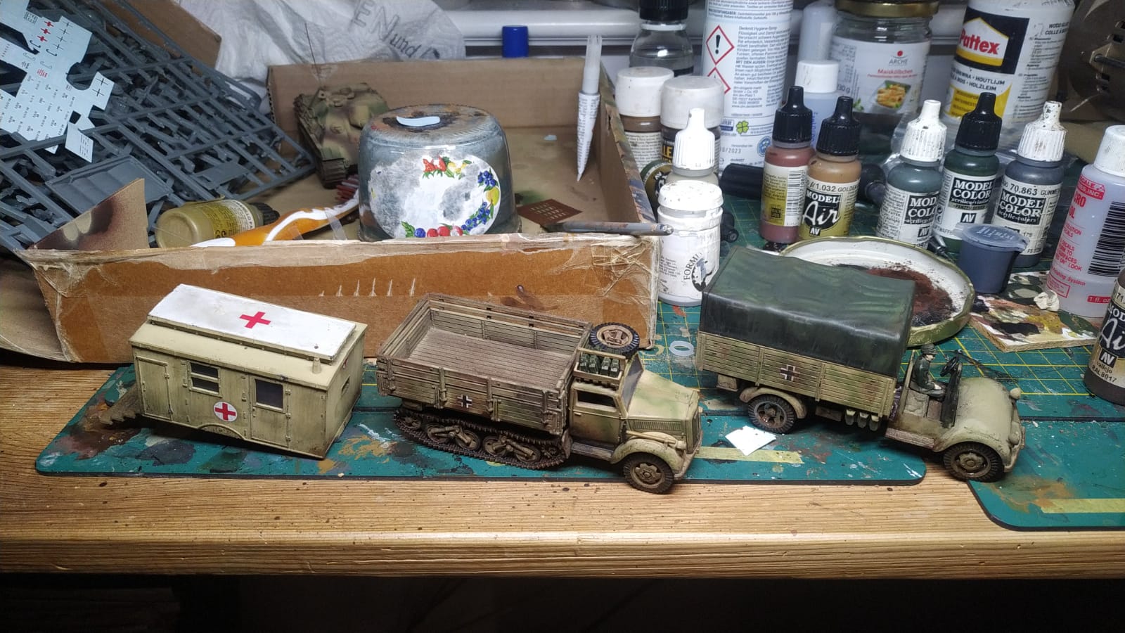 Aus dem RUBICON MODELS Maultier (280046 SdKfz 3a Opel Maultier) und einem RUBICON Einheitskoffer (280047 SdKfz 305/3a Expansion - Box Body), letzteres magentisiert, habe ich mit den übrigen Teilen und Teilen aus der Bitzbox sowie Plastikcard einen Opel Blitz gebaut. Man muss lediglich die Fahrerkanzel tauschen und kann dann entweder Maultier oder Blitz spielen. Maultier auch als Sani-Fahrzeug. Praktisch