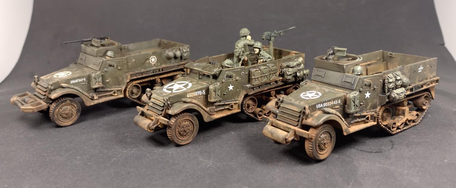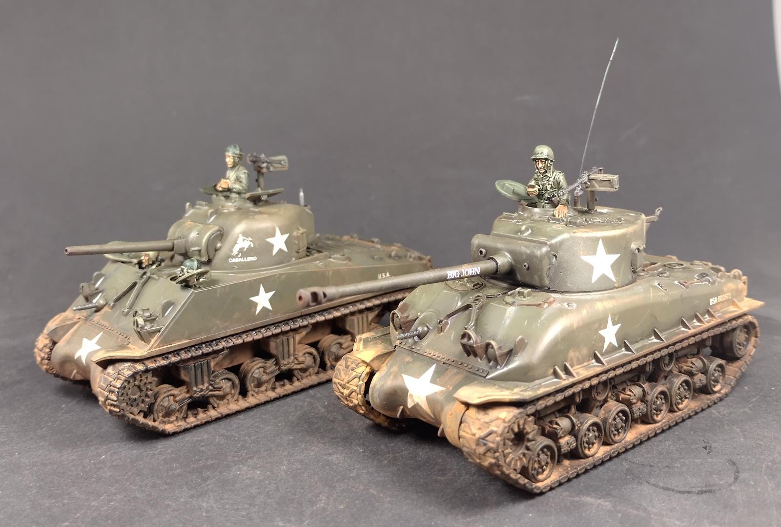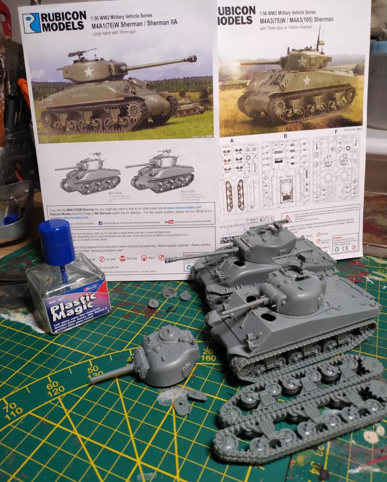 Einmal ein M4A1 76, welchen ich mit einem HVSS Fahrwerk aus dem Bausatz des M4A3 ausgestattet habe und den M4A3 mit "Winterketten". Natürlich kann man die Türme untereinander tauschen. Rubicon hat hier wieder mal feinstens abgeliefert.