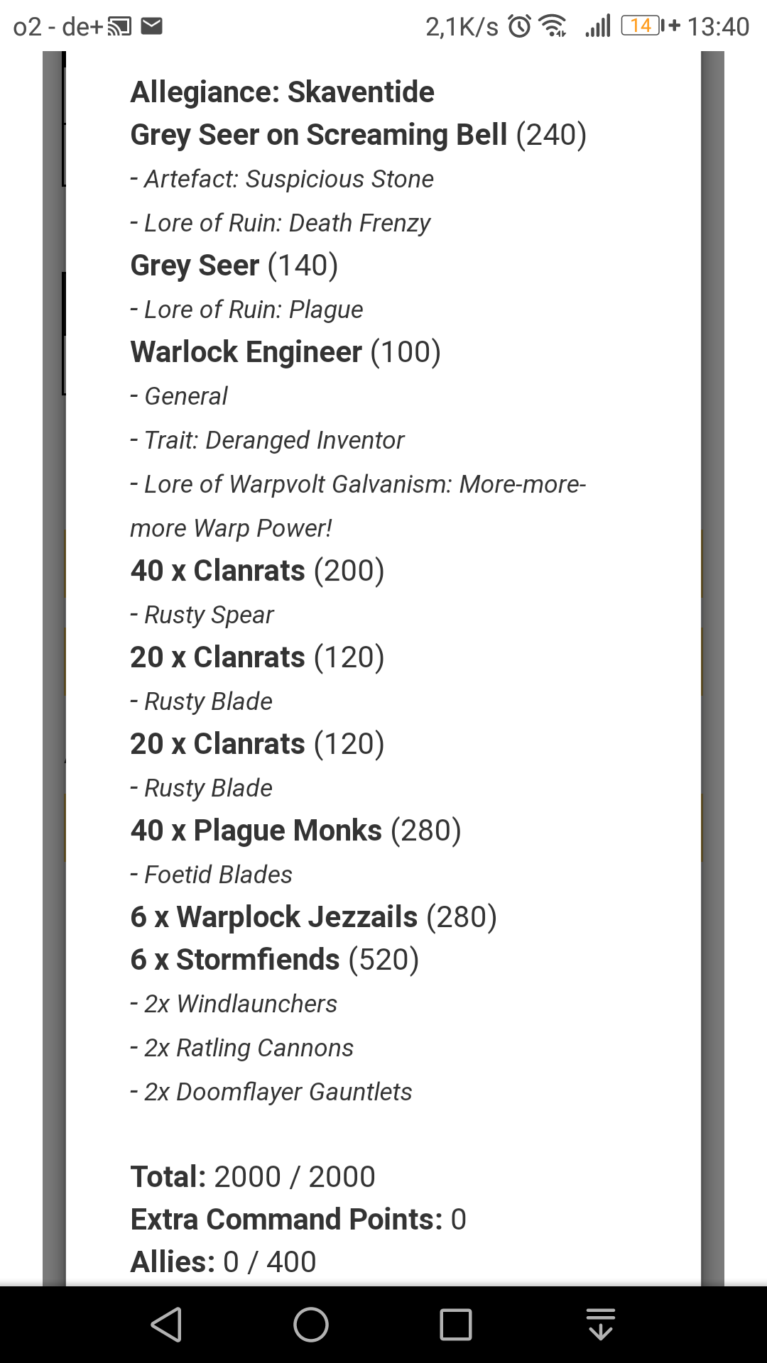 Jeder Spieler tritt mit einer 2000-Punkte-Liste an, die auch in diesem Forum gepostet wird.