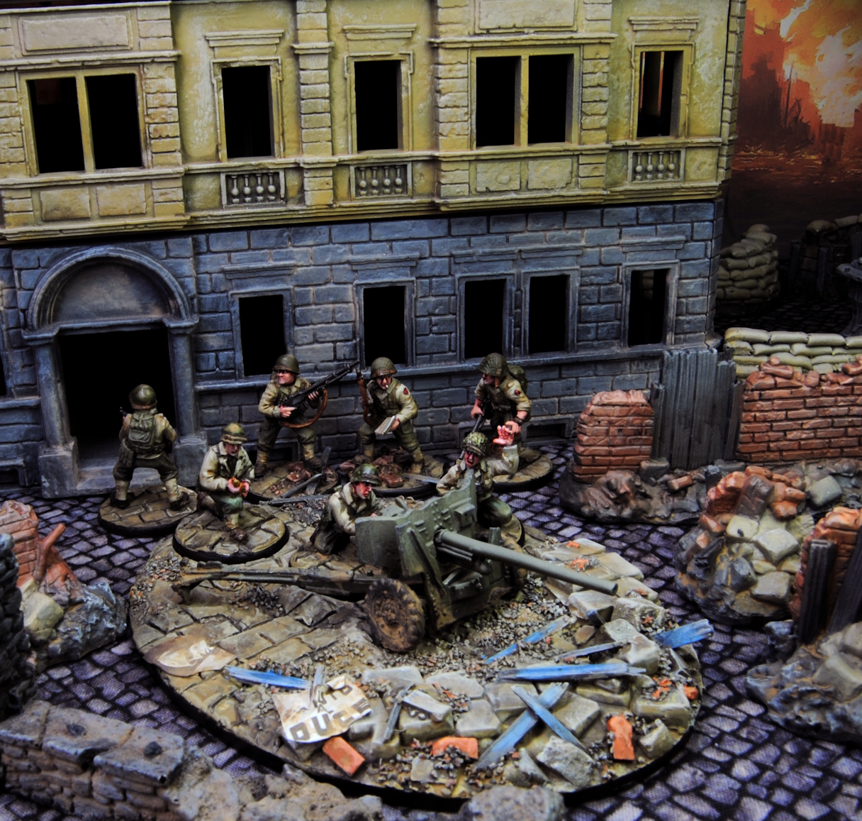 Historisch habe ich mich an die 34th US Infantry Division "Red Bull" gehalten. Bereits 1942 in Nordafrika eingesetzt, hat sie sich aber ihre Sporen in Italien verdient. In der 1.Monte Cassino-Schlacht überwandt sie den Gari und kämpfte sehr verlustreich in Cassino-Stadt und den angrenzenden Hängen bis sie ausgeblutet aus der Front genommen werden musste. Nach Cassino und der Auffrischung kämpfte sie bei Anzio und erfolgreich in Norditalien. Sie war maßgeblich an der Eroberung von Bologna beteiligt.