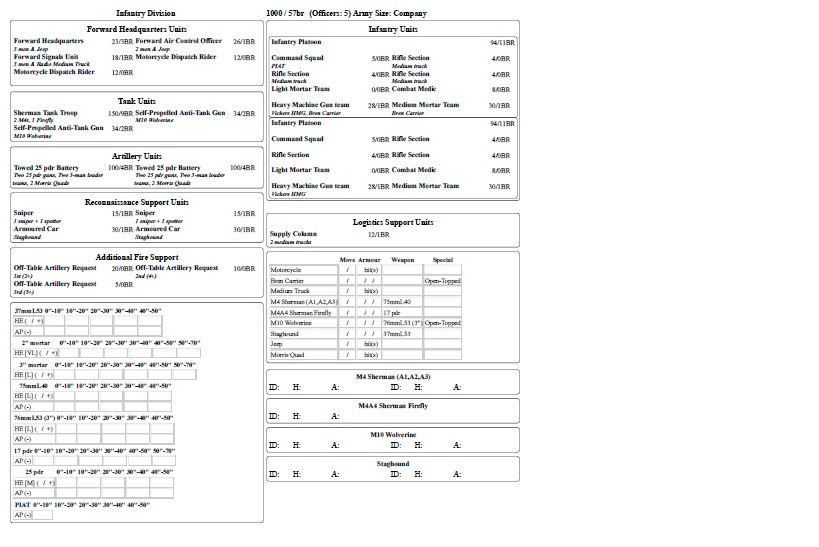 Ich habe mich stark am normalen TOE der 2nd NZ in 1944 orientiert, sprich die Staghounds kommen von der DivCav, die Wolverines vom 7th AT Regiment, die Shermans von der 4th Armoured Brigade, die 25 Pfünder vom Field Regiment der Division und die Infanterie aus dem Motor Battalion der 4th Armoured Brigade.