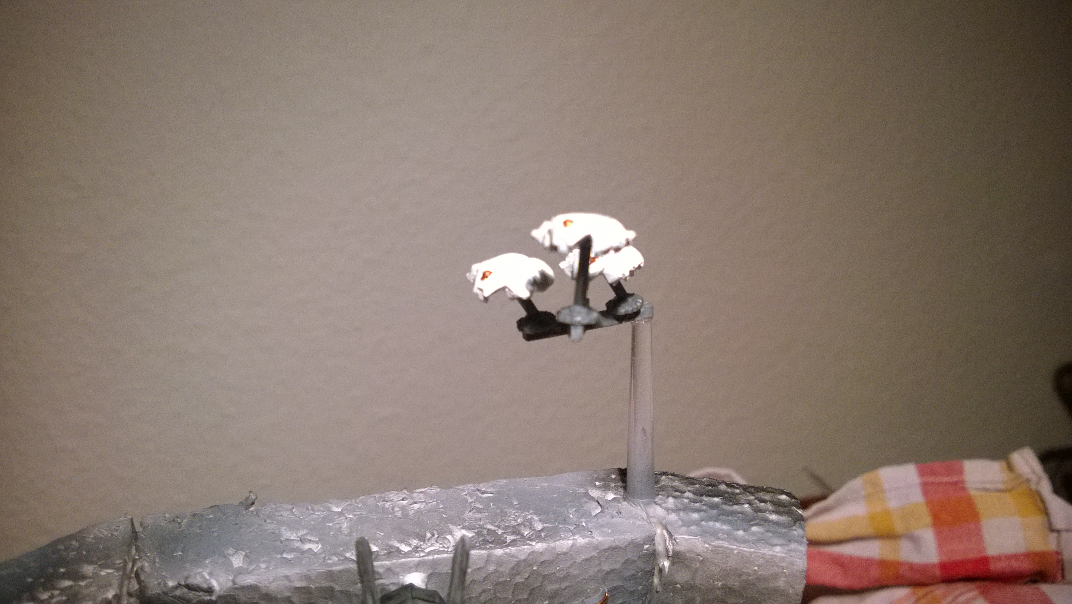 Ich würde auf jeden Fall noch mal über die Styroporteile drübergehn (hier hätte es ruhig dickere Farbe sein dürfen ;)). Nur halt nix mit Lösungsmitteln verwenden, sonst hast du eine Nurgle-Landschaft (gut, das kann auch seinen Charme haben!)...