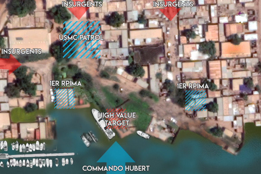 Die US Marines kommen von der nördlichen Spielfeldkante/Straße ins Spiel. Die Männer vom 1er RPIMA sind westlich im Gebäude hinter der Tankstelle, während sich der DMR Schütze auf dem Dach selbiger positioniert hat. Ebenfalls wird im östlichen Teil der Karte an der Werbetafel Stellung samt Hund bezogen. Comando Hubert geht im Yacht-Hafen an Land.