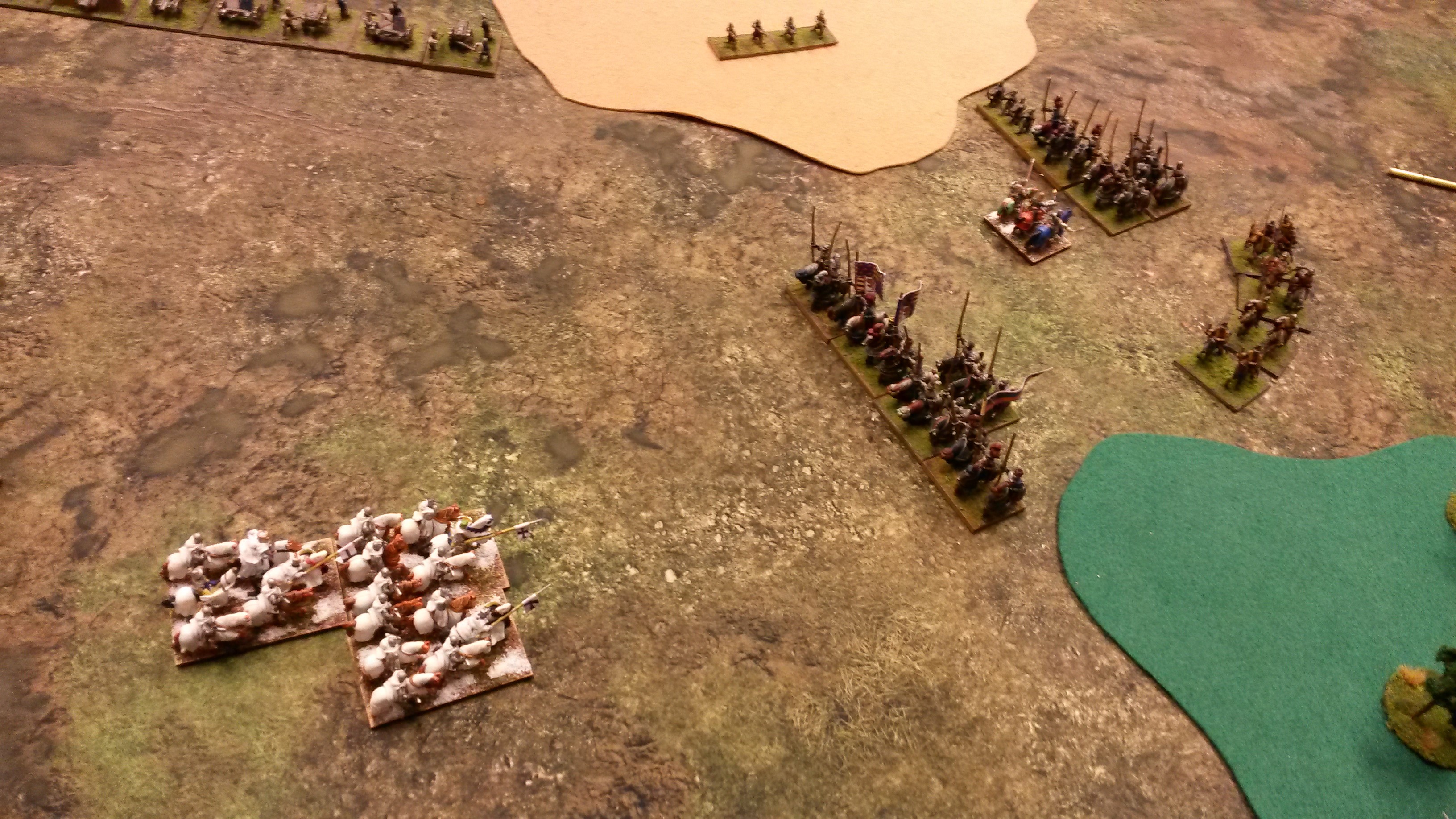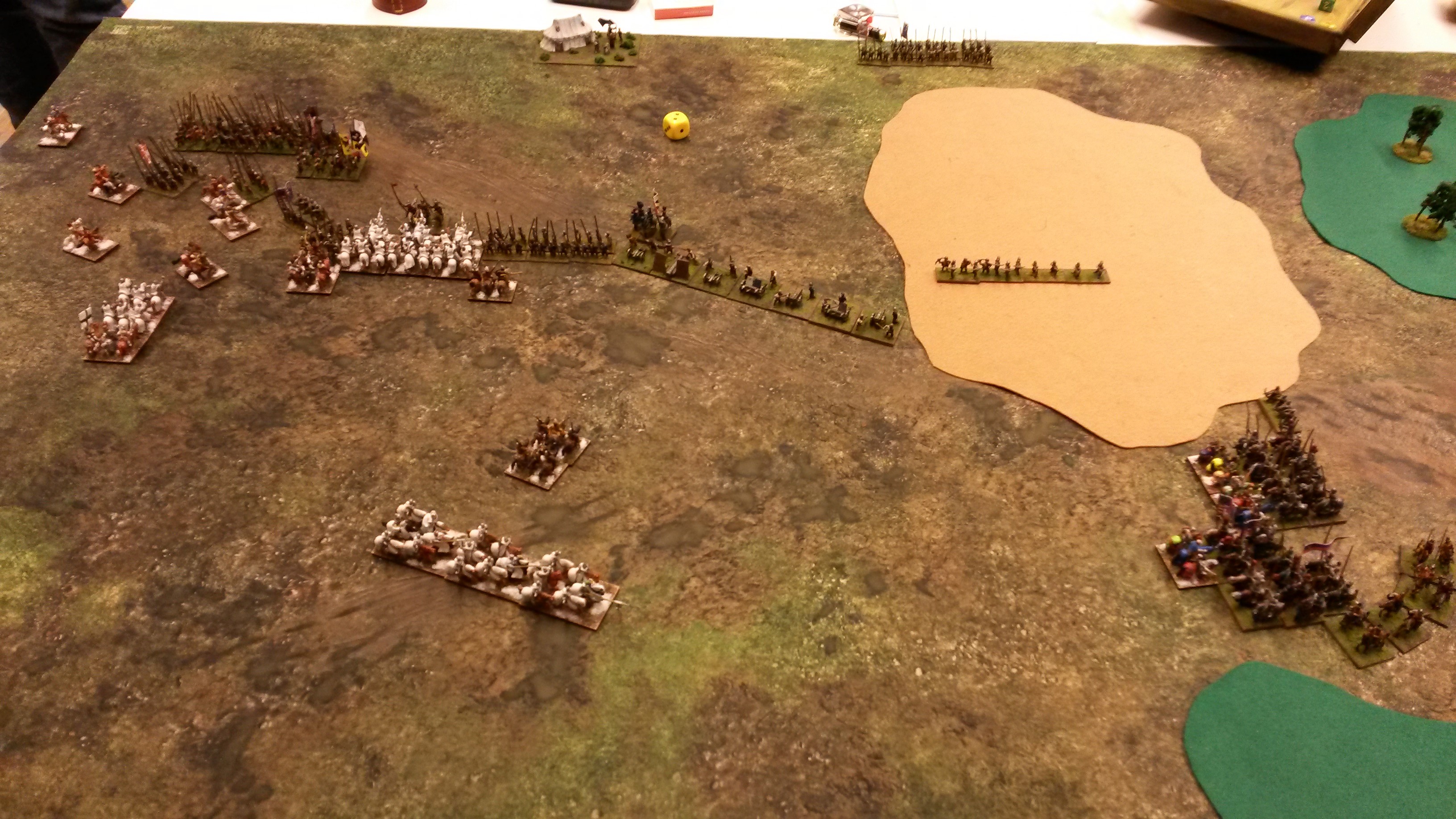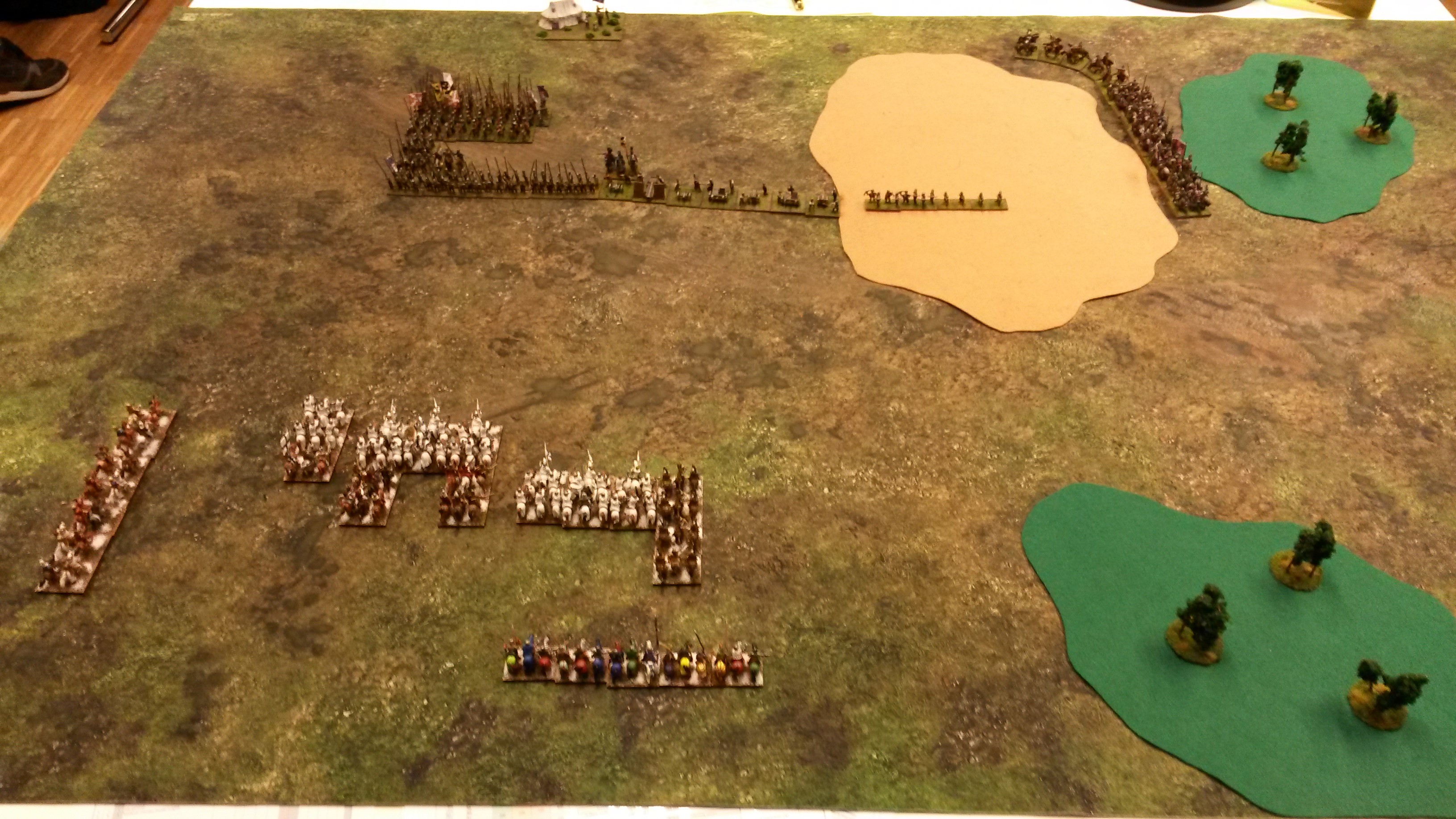 Die Burgunder waren die Invasoren, der Deutsche Orden hat verteidigt. Das Gelände lag günstig für mich, mit einem großen Sumpf auf Seiten der Burgunder, der ihr Aufmarschgebiet praktisch geteilt hat, außerdem lagen einige Wälder auf der rechten Seite des Schlachtfelds. Links lag gar nichts. Die Burgunder mussten, obwohl sie Invasoren waren, trotzdem als Erste aufstellen. Der Burgunderherzog Karl der Kühne ist ein Inert-General, weshalb er eine relativ große Anzahl an Truppen ins Feld führen konnte. Von links nach rechts (aus der Perspektive des Deutschen Ordens) standen zwischen linker Tischkante und dem Sumpf: ca. 20 PkO, ca. 10 BwX, 7 ArtO/I. Im Sumpf standen noch ein paar BwO und Plänkler. Rechts vom Sumpf stand ein Kommando mit überwiegend KnO und einigen Lh. Der Deutsche Orden hat von links nach rechts ein Kommando mit 7 LhO und 3 KnS, zwei Kommandos mit je 3 doppelbasierten KnS und 4 CvO bzw. CvI und dahinter versetzt ein Kommando mit 5 alliierten Medieval German KnO aufgestellt.