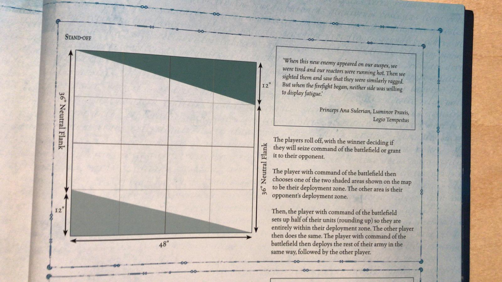 Unsere Aufstellungszone Standoff: Da ich mehr als 200Pkt unter Ivos Streitmacht lag wurde mit den Underdog Regeln gespielt. Das heißt beim zufälligen ermitteln der Missionsziele musste ich nicht offen legen welche Mission ich Spiele während ich die ganze Zeit wusste welches Ziel Ivo verfolgte. Meine Wahl nach dem auswürfeln fiel auf Ruhm und Ehre, mit dem Ziel seinen Psi Titanen so schnell wie möglich zu töten um möglichst viele Punkte zu kriegen und mich dann auf dem Schlachtfeld aufzuteilen um auch das Sekundärziel zu erfüllen. Ivo hatte leider Angreifen & Zerstören ausgewürfelt wodurch er einfach nur töten musste.