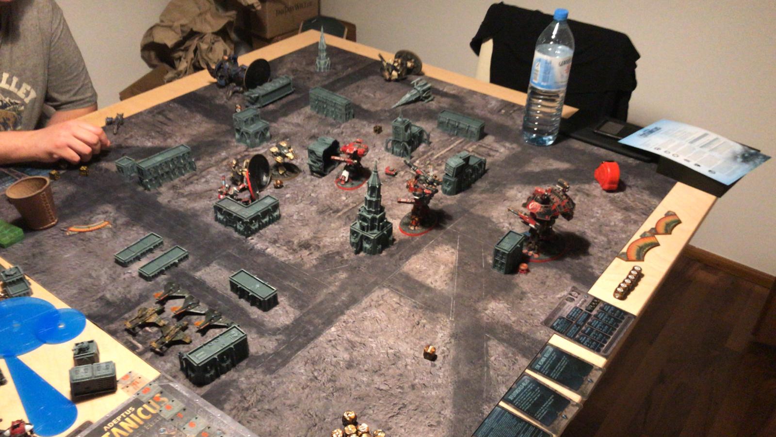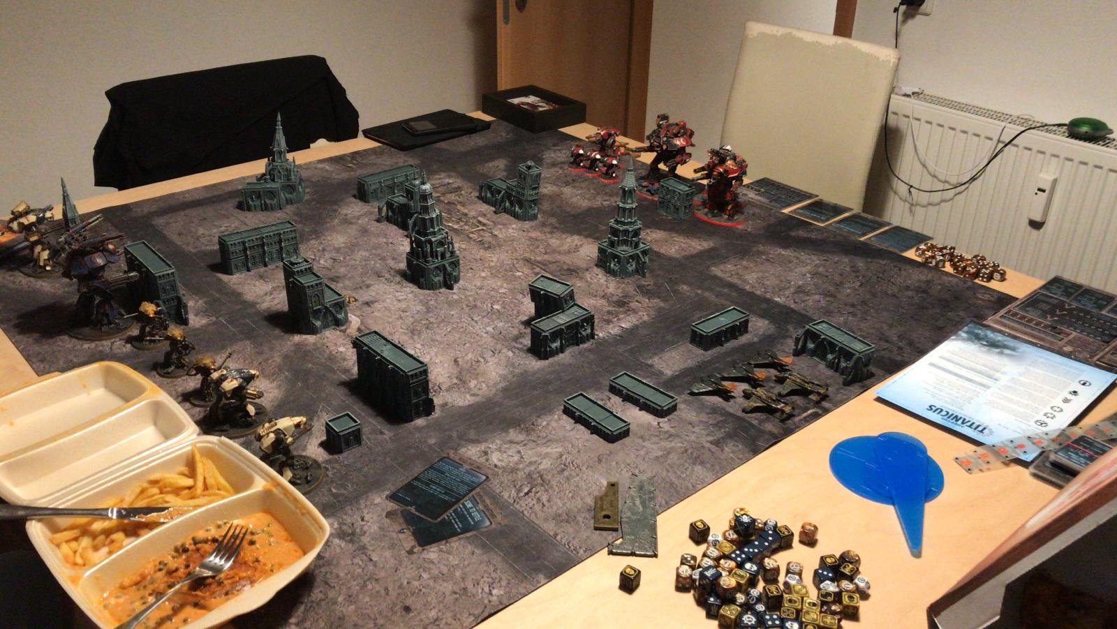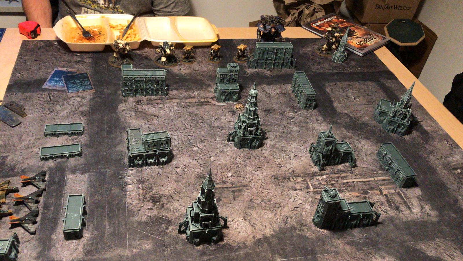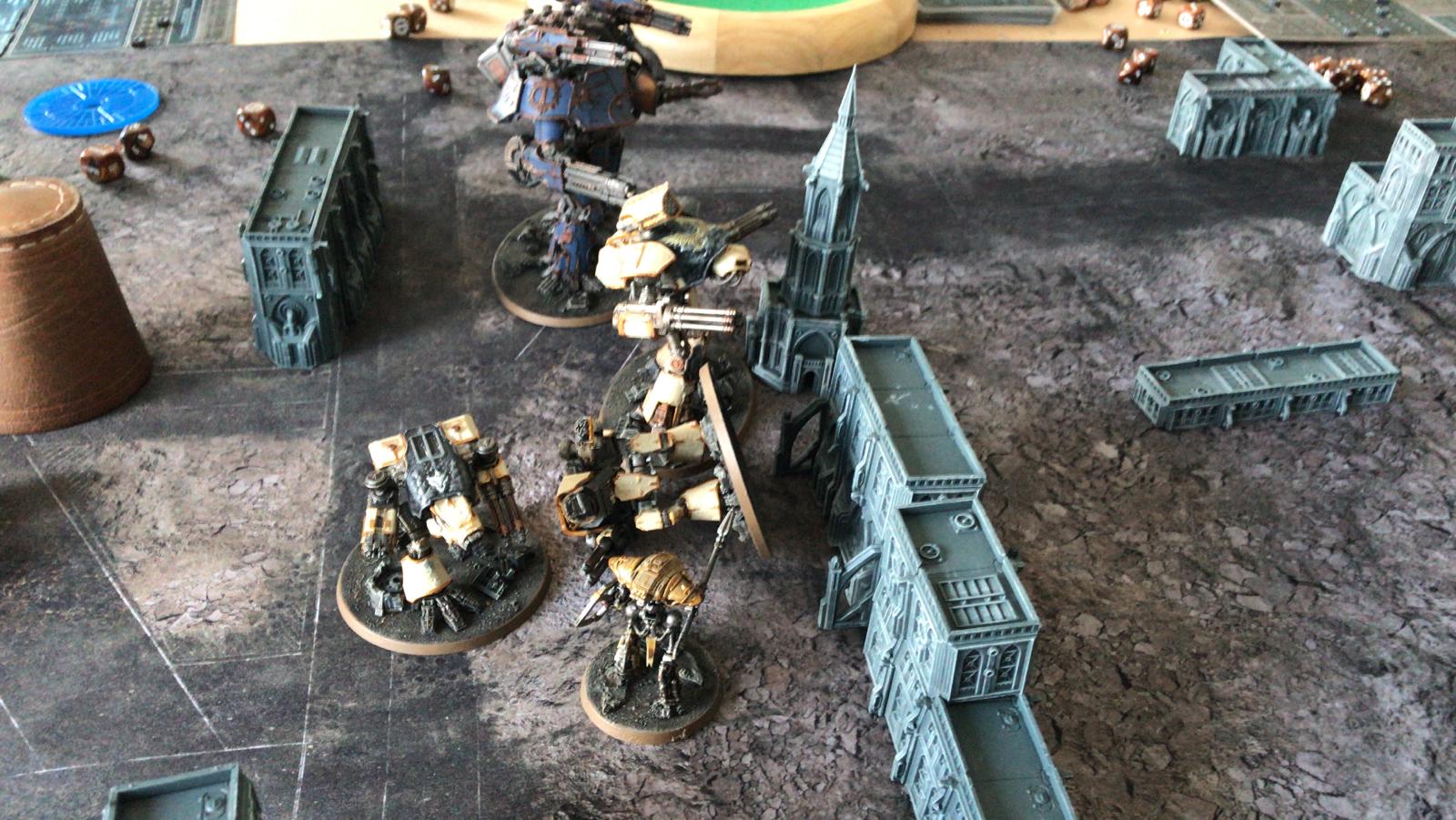 Und das große Rematch gegen Ivo. Wieder im mittleren Bereich mit ~1750Pkt pro Seite, doch dieses Mal habe ich auch einen Warlord Titan dabei um grausame Rache im Namen des Maschinengottes zu nehmen an dem was nicht existieren darf!