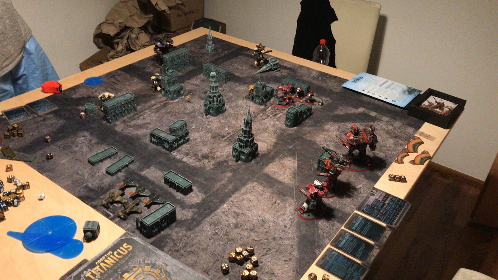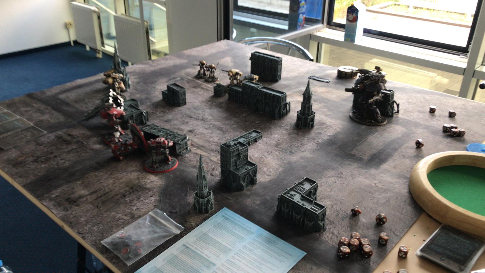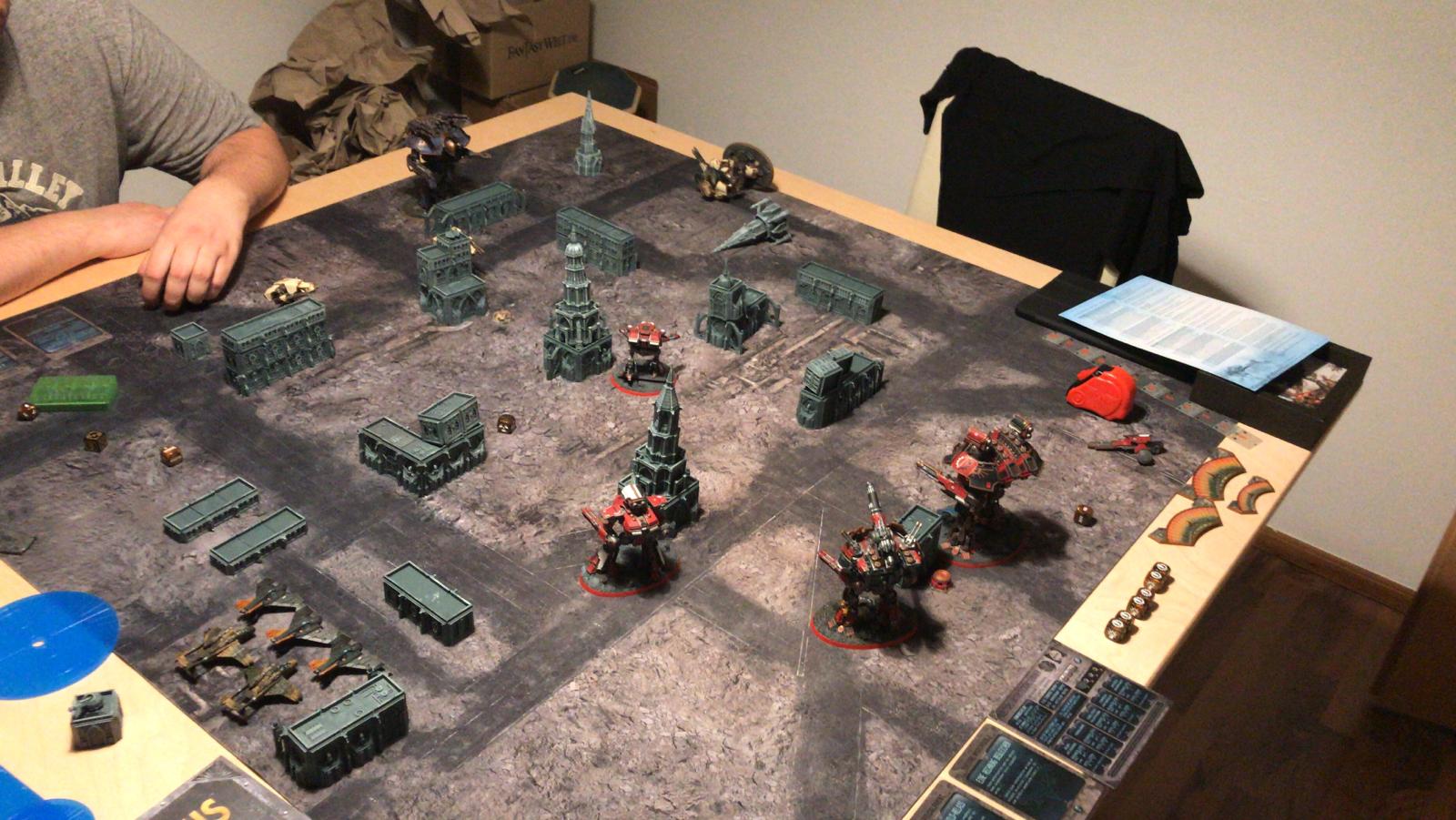 Und das große Rematch gegen Ivo. Wieder im mittleren Bereich mit ~1750Pkt pro Seite, doch dieses Mal habe ich auch einen Warlord Titan dabei um grausame Rache im Namen des Maschinengottes zu nehmen an dem was nicht existieren darf!