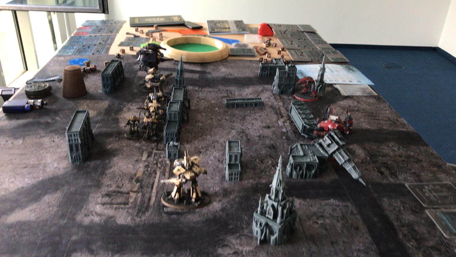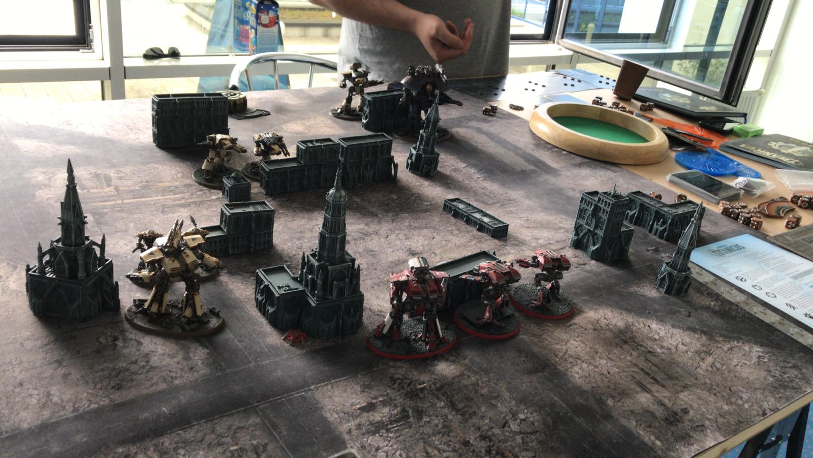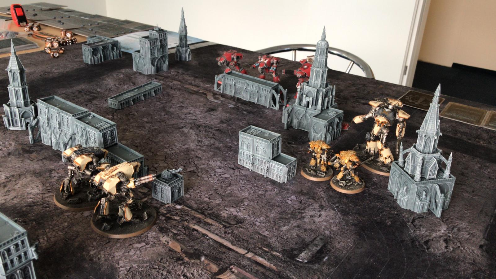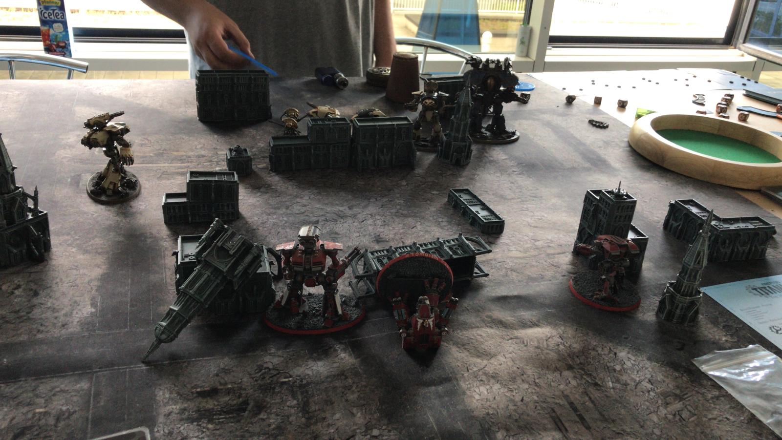 Und das große Rematch gegen Ivo. Wieder im mittleren Bereich mit ~1750Pkt pro Seite, doch dieses Mal habe ich auch einen Warlord Titan dabei um grausame Rache im Namen des Maschinengottes zu nehmen an dem was nicht existieren darf!