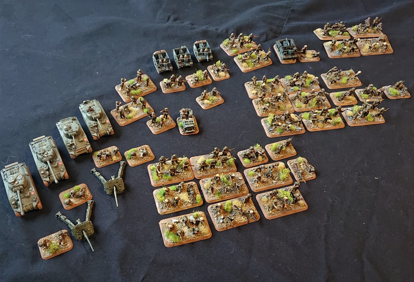 Unser spielerisches Setting soll erstmal der "Late War" (44-45) sein. Genutzt zur Listenerstellung habe ich daher den Selektor "British Armoured Division" aus dem Battlegroup: Overlord-Regelbuch. Das hat Vor- aber auch Nachteile in Bezug auf die Realitätsnähe. Vorteil ist ganz klar, dass ich einen leichten Panzerzug (M3 Stuart), einen Staghound und motorisierte Infanterie mitnehmen kann neben dem obligatorischen M4-Zug mit Firefly. Damit kann ich die charakteristischen Fahrzeuge der Division wieder in kleinerem Maßstab abbilden. Nachteil ist aber, dass die Motor Rifles der integralen Panzerbrigade der Division nicht über M5 Halbketten verfügt haben sondern lediglich die standardisierten 15 bzw. 30 cwt Lkw zum Transport genutzt haben. Vielleicht lasse ich mir hier was einfallen und spiele Kangaroo APCs als Halbketten. Hier wurden Teile der Infanteriebrigaden der Division nämlich im Kampf um die Gotenstellung in die Fahrzeuge der Kangaroo Army verfrachtet.