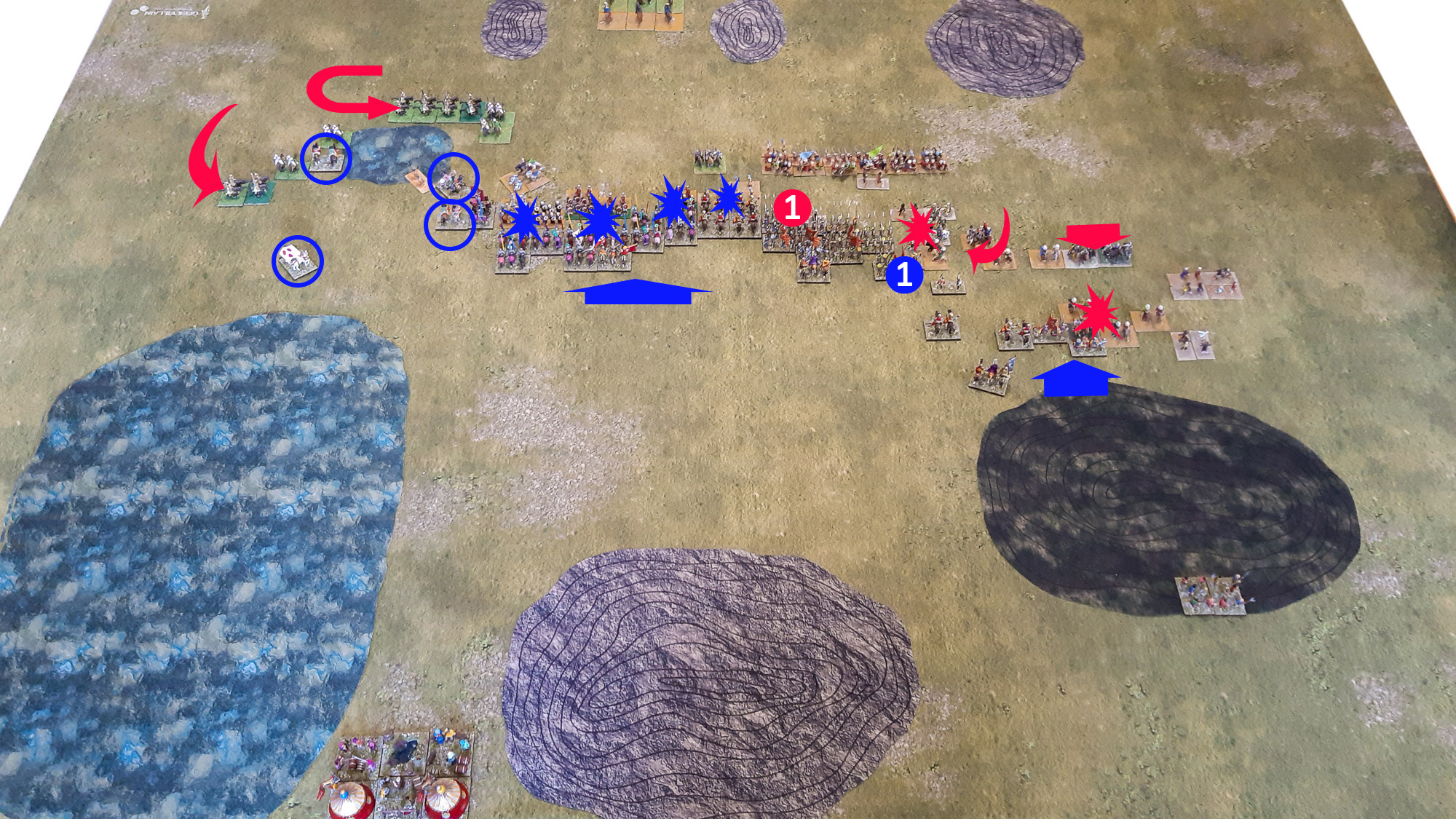 In der rechten Hälfte des Schlachtfelds kamen die venezianischen Pikeniere nicht so schnell voran, wie geplant, da sie von einzelnen, von den Berbern wirkungsvoll platzierten Plänkler-Abteilungen aufgehalten wurden (rote 1). Die rechte Flanke der Pikeniere wurde unterdessen von Plänklern der Berber sowie einschwenkenden leichten Reitern attackiert, aber den Venezianern gelang es, mit einigen abkommandierten Pikenträgern sowie den dort stehenden leichten Bogenschützen (Ps (O)) dagegen zu halten, so dass die Haupstreitmacht der Pikeniere ungefährdet blieb (blaue 1). Weiter rechts haben die Kampfhandlungen ebenfalls begonnen, nachdem alle Verbände der Venezianer den bewaldeten Hügel verlassen hatten. An dieser Stelle waren die Kontrahenten in dieser Phase der Schlacht erst noch dabei, sich zu formieren. Für die Venezianer war die Lage hier kritisch, da sie sowohl qualitativ wie quantitativ deutlich unterlegen waren. Die Entscheidung, ungeachtet dessen die sichere Hügelposition zu verlassen, mag sicherlich fragwürdig erscheinen - die Gefahr, dass die leichte Reiterei der Berber ungehindert in den Rücken der gesamten venezianischen Armee gelangt, rechtfertigte in den Augen der venezianischen Generalität aber dieses Manöver.