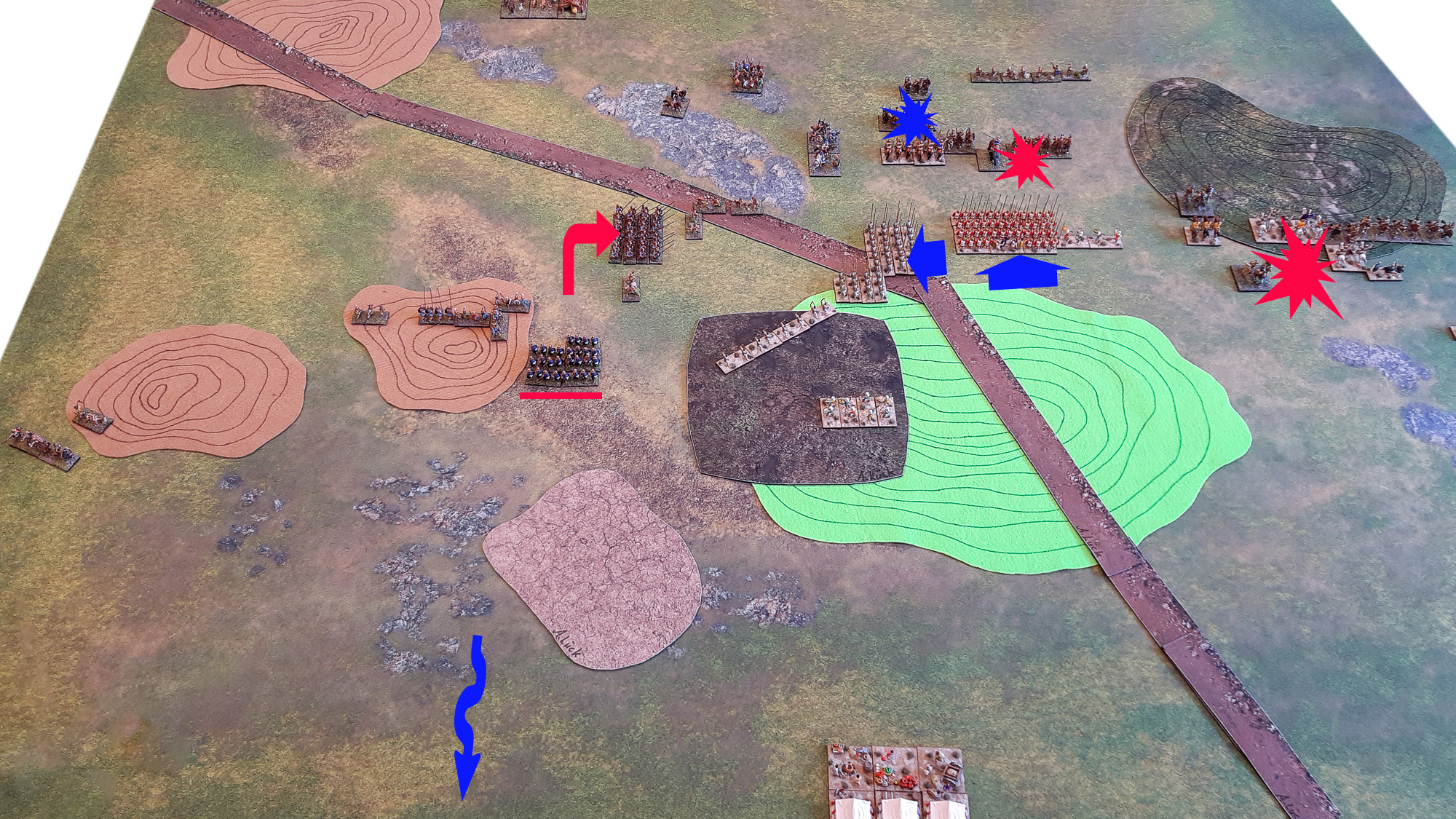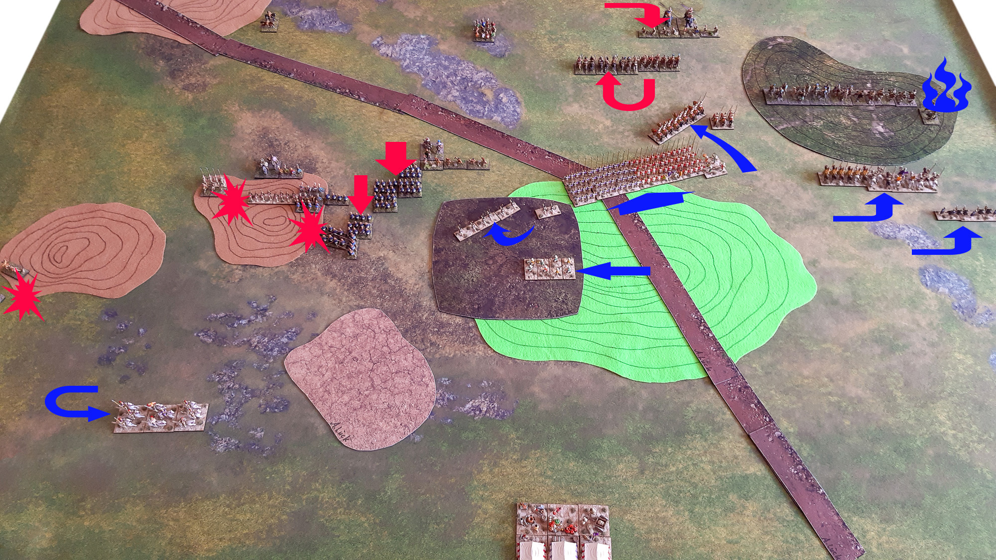 (1) Arnim, gegen den ich noch nie zuvor gespielt hatte, übernahm die Rolle des Pyrrhos (in der nicht-brillanten Version), ich selbst schlüpfte in die Rolle von Seleukos. Da die Seleukiden die Verteidiger waren, durften sie mehr Gelände wählen, mussten ihre Armee aber als erste aufstellen. Ich legte einen großen Gentle Hill mittig in das seleukidische Aufmarschgebiet, zwei kleine Rough Hills links daneben, sowie einen mittelgroßen Rough Hill, der ganz weit hinten am Schlachtfeldrand der gegnerischen Seite landete. Arnim legte einen mittelgroßen Gentle Hill in seine rechte Aufmarschzone, ein weiterer Rough Hill landete in meiner Zone unweit der beiden schon liegenden Rough Hills und - unerwartet für die Seleukiden - ein Vineyard überlagerte schließlich den Südhang des großen Gentle Hills. Zudem legte Arnim eine Straße, die quer über das Schlachtfeld führte.