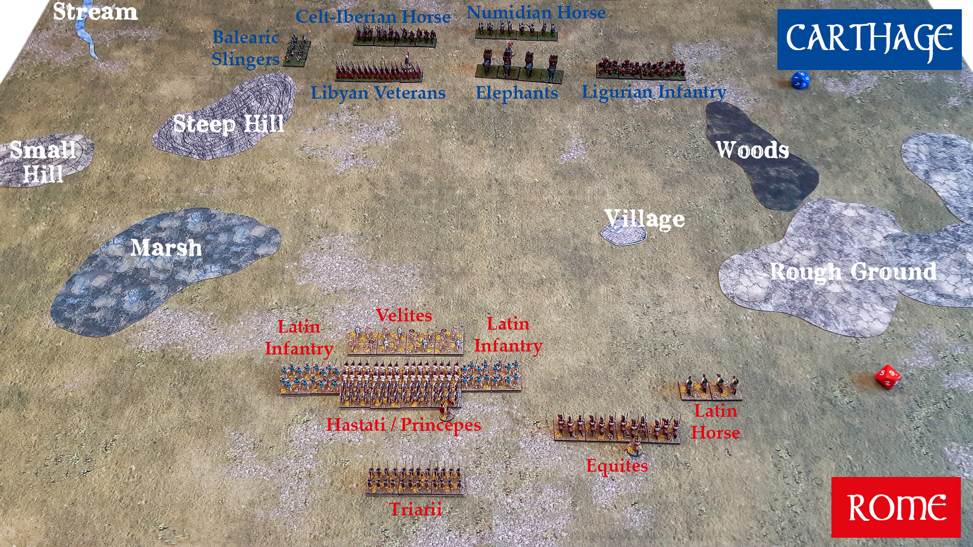 Jan stellte seine Karthager den Römern exakt vis-à-vis auf und nutzte dabei, ebenso wie die Römer, das offene Areal zwischen dem Gelände optimal aus. Die karthagische Gefechtsordnung gliederte sich in sechs Schwerpunkte: Der erste vorne links (aus Blickrichtung der Römer) bestand aus Lybischen Veteranen (Spears), zentral nahmen Afrikanische Elefanten (Elephants) Aufstellung, rechts daneben als ungestüm eingestufte Ligurier (Warband). Hinter den Lybiern positionierte sich die ebenfalls ungestüme Keltiberische Reiterei (Medium Horse), hinter den Elefanten stand die Numidische Reiterei (Light Horse). Ganz links, am Fuße des steilen Hügels, formierte sich eine kleine, aber aufgrund ihrer Fernkampfstärke gefährliche Abteilung Balearischer Schleuderer (Skirmishers).