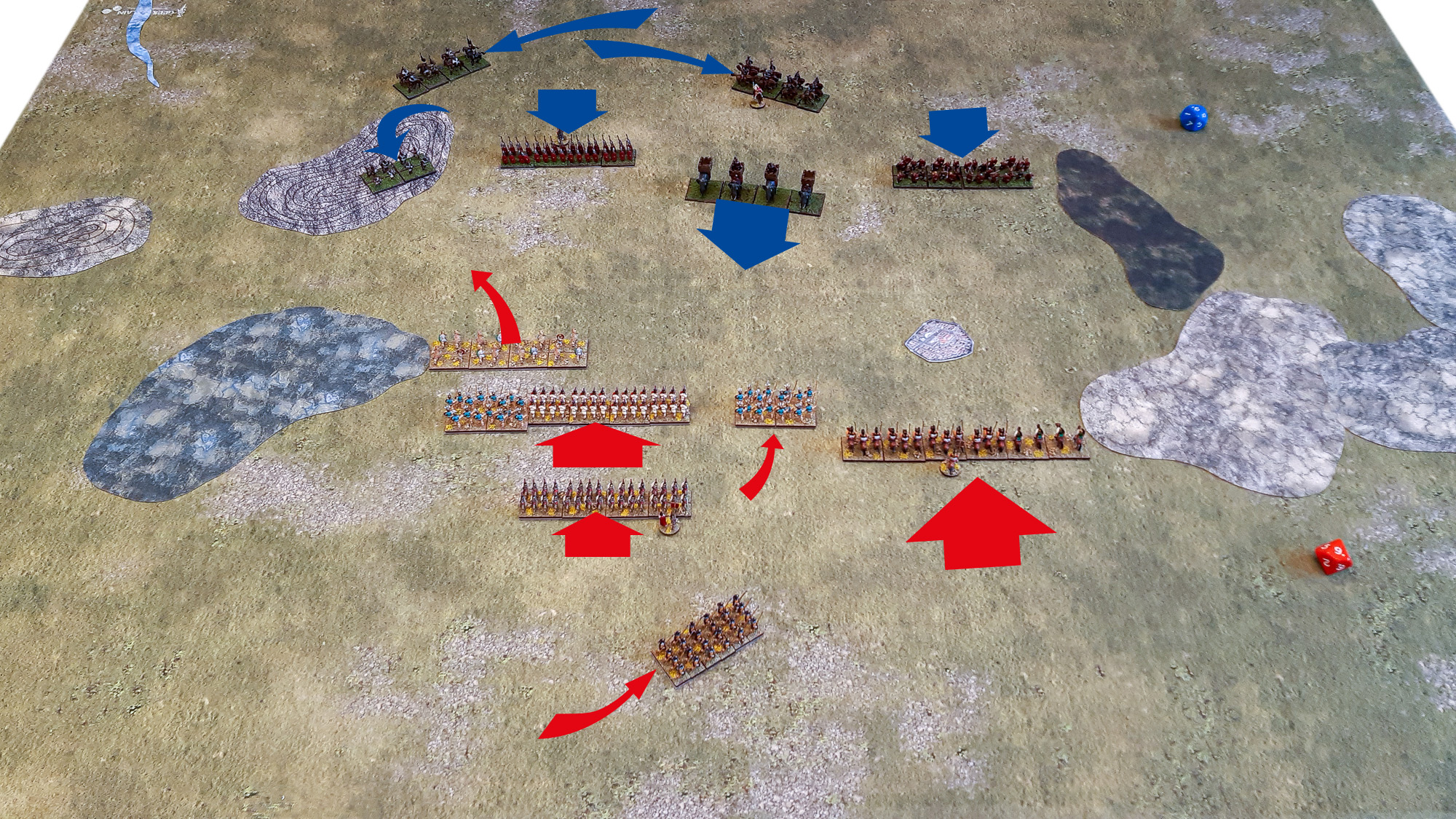 Die vorgeschobenen römischen Velites eilten entlang der Sumpfzone schleunigst nach links hinüber, um der Bedrohung sowohl durch die Balearischen Schleuderer als auch der Numidischen Reiterei zu begegnen - ein Missionsziel mit hohem Schwierigkeitsgrad. Derweil formierten sich die Triarier im rückwärtigen Bereich in Marschkolonnen mit Stoßrichtung Zentrum, mit der Absicht, die drohende Lücke zwischen Hastati und abdriftender Latinischer Infanterie zu schließen - wären sie als Speerkämpfer doch die idealen Truppen, um die karthagischen Elefanten zu kontern. Allerdings kam der Einsatzbefehl der römischen Generalität etwas zu spät; die Einheit hing noch weit zurück und würde schlimmstenfalls nicht rechtzeitig am Brennpunkt präsent sein.