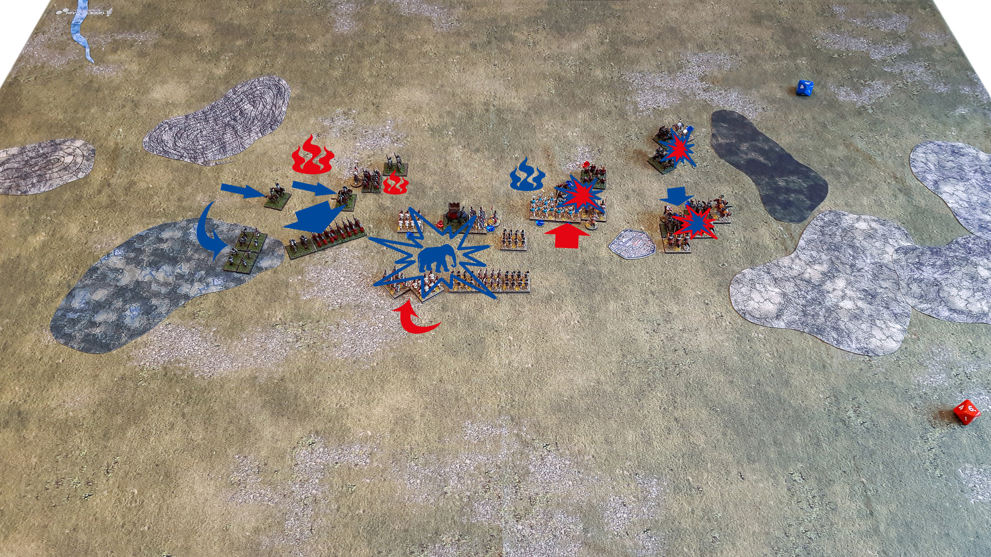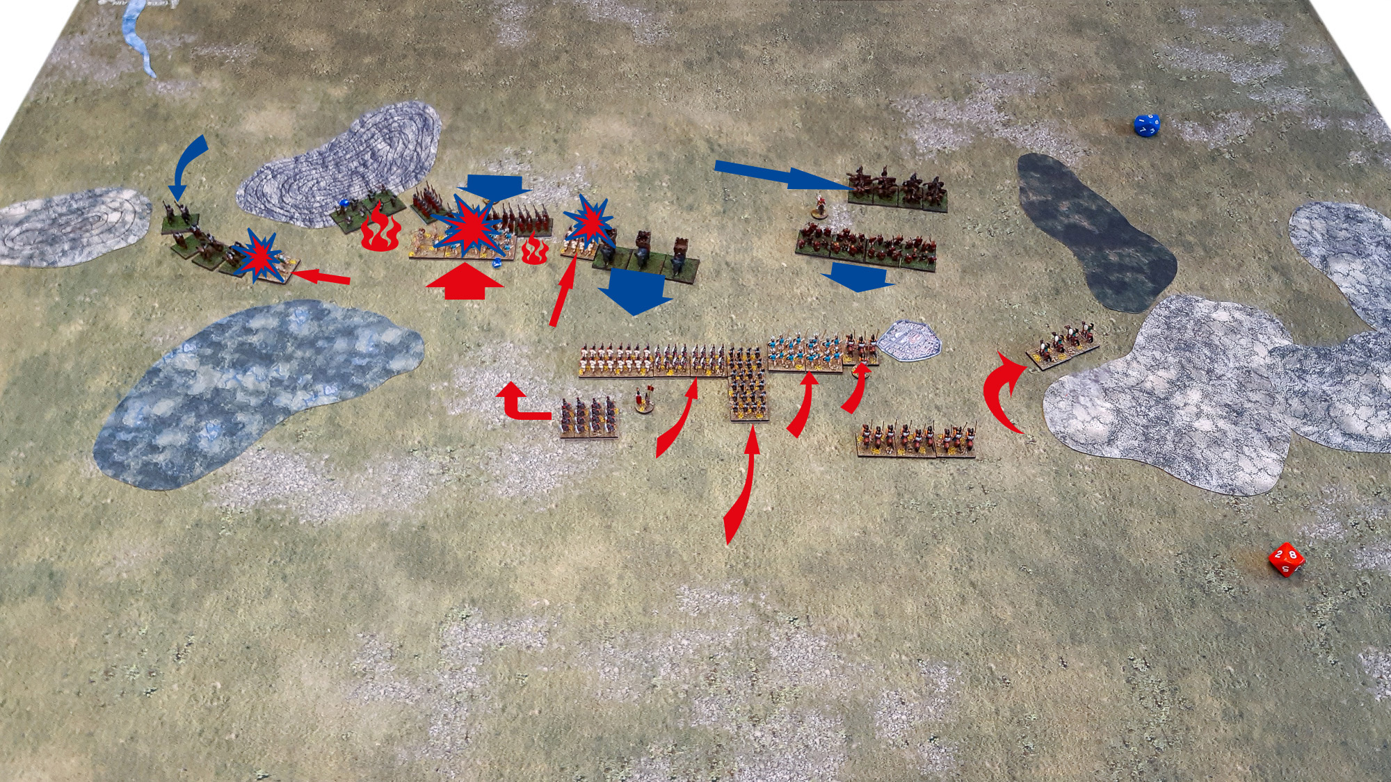 Die römischen Velites stellten sich den Balearischen Schleuderern und der Numidischen Reiterei, konnten letztere sogar in ungünstiger Kolonne abfangen, unterlagen aber schrittweise dem gegnerischen Druck. Die Latinische Infanterie des linken römischen Flügels und Teile der Hastati waren ebenfalls weit vorgedrungen und griffen die Lybischen Veteranen an, erlitten aber erste Verluste. Überraschend gelang es einem Hastati-Kontingent, einen karthagischen Elefanten im Frontalangriff nieder zu ringen – ein bemerkenswerter Einzelerfolg! Die übrige Elefantenlinie setzte den Vormarsch unbeirrt fort. Im Zentrum formierte sich die römische Gefechtslinie indes um – Teile der Principes aus der zweiten Reihe schwenkten zur Verstärkung nach rechts aus, um eine Linienverlängerung gegen drohende karthagische Durchbrüche zu realisieren. Auch die Triarier konnten nun in die Linie eingebunden werden, wenngleich nur teilweise, da sie noch in tiefer Marschordnung operierten. Die andere Hälfte der Principes wurde bereits zur bedrohten linken Flanke abkommandiert.
