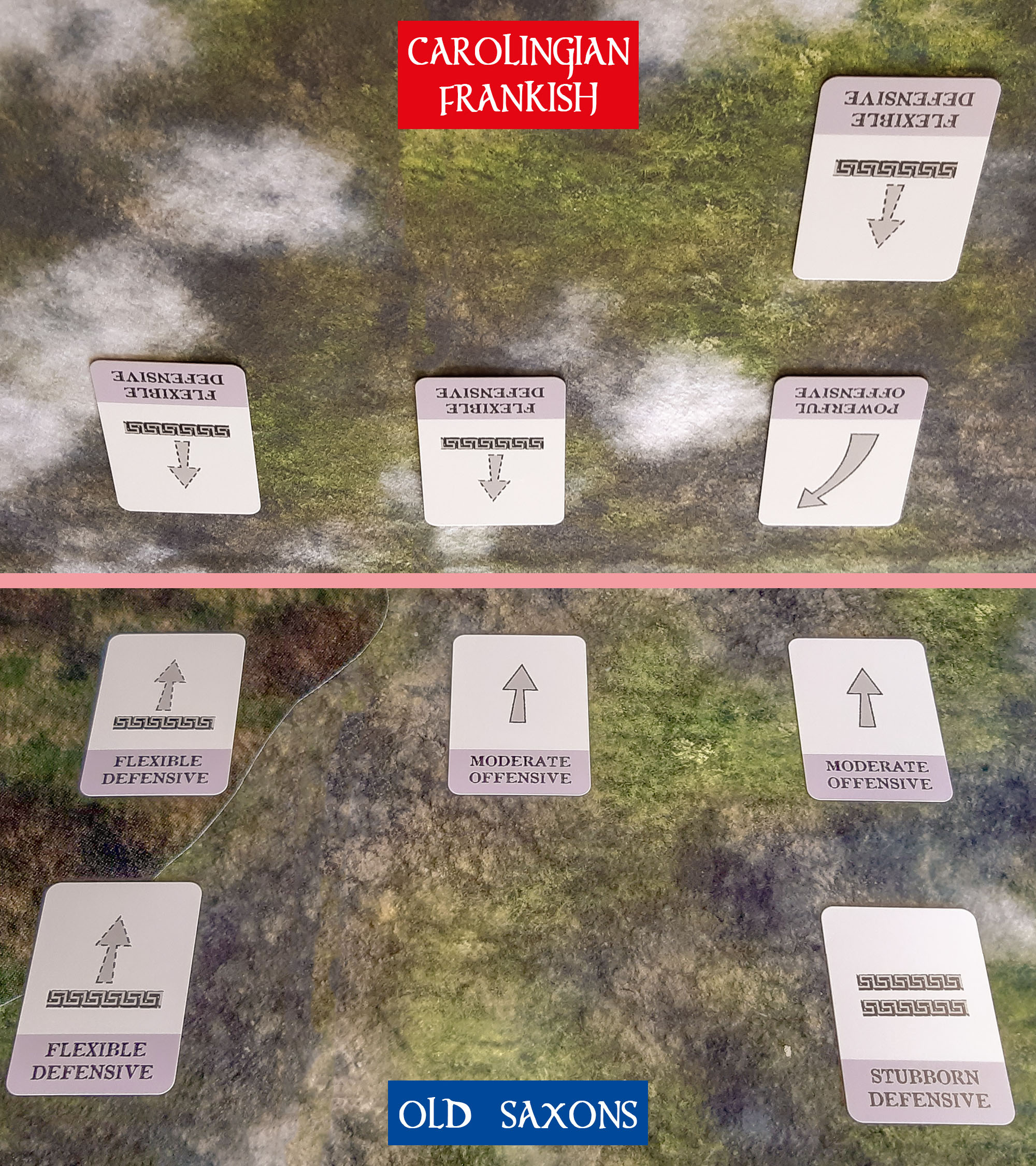 Danach wurde bestimmt, welche Armee überhaupt an der oberen und welche an der unteren Tischkante Aufstellung beziehen, und welche Armee zuerst das Schlachtfeld betreten würde: Der Würfel entschied, dass die Sachsen an der unteren Tischkante antreten und als Erste Aufstellung bezogen. Die taktischen Karten, die für die untere Tischkante gezogen wurden, wurden nun aufgedeckt und ich versuchte, die Sachsen (einigermaßen) passend zur taktischen Ausrichtung aufmarschieren zu lassen. Anschließend wurden die Karten für die obere Tischkante aufgedeckt und die Karolinger nahmen gemäß ihrer taktischen Disposition Aufstellung. Beide Armeen zeigten eine überraschend defensive Ausrichtung - eine für beide Kommandanten gleichermaßen fordernde Ausgangslage. Hier ein Foto von den aufgedeckten taktischen Karten: