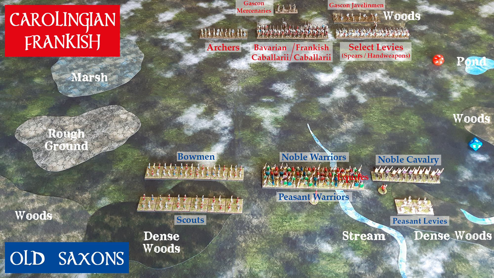 Anschließend nahm das Heer der Karolinger Aufstellung. Ihre Kräfte gliederten sich in vier Hauptformationen plus einer zentralen Reiterreserve, die fast alle auf Defensive, aber mit taktischer Flexibilität, ausgerichtet waren - bis auf ein Aufgebot, das kraftvoll offensiv operieren sollte und von Karl selbst befehligt wurde. Aber der Reihe nach, von links nach rechts (hier und im Folgenden aus Blickrichtung der Sachsen): Eine Abteilung Bogenschützen (Archers) bildete den linken Flügel, vis-à-vis den allerdings zahlenmäßig überlegenen sächsischen Schützen. Das Zentrum bestand aus der kampferprobten schweren Reiterei, den sog. Caballarii, welche im rechten Zentrum aus den elitären Franken (Heavy Horse) und im linken Zentrum aus den alliierten Bayern (Medium Horse) gebildet wurde - wohlgemerkt abweichend von ihrer üblichen Rolle ungewöhnlich defensiv ausgerichtet. Was führte Karl im Schilde? Während sein zweiter Kommandant das Zentrum befehligte, führte er selbst in Persona die Truppen des rechten Flügels ins Feld, welcher im vorderen Teil aus dem Fußtruppenaufgebot, das sich innen aus Speerkämpfern (Spears) und außen aus Schwertkämpfern (Handweapons) zusammensetzte, bestand. Dahinter, in einer rückwärtigen Formation in einem Wald, standen plänkelnde, leichtbewaffnete Truppen (Skirmishers). Der vordere rechte Flügel war, wie erwähnt, entschlossen offensiv ausgerichtet und in den Augen Karls dafür vorgesehen, die sächsische Reiterei aufzureiben. Eine kleine Söldnereinheit leichter Reiter (Light Horse) aus der Gascogne bildete eine zentral im rückwärtigen Raum platzierte Reserve.