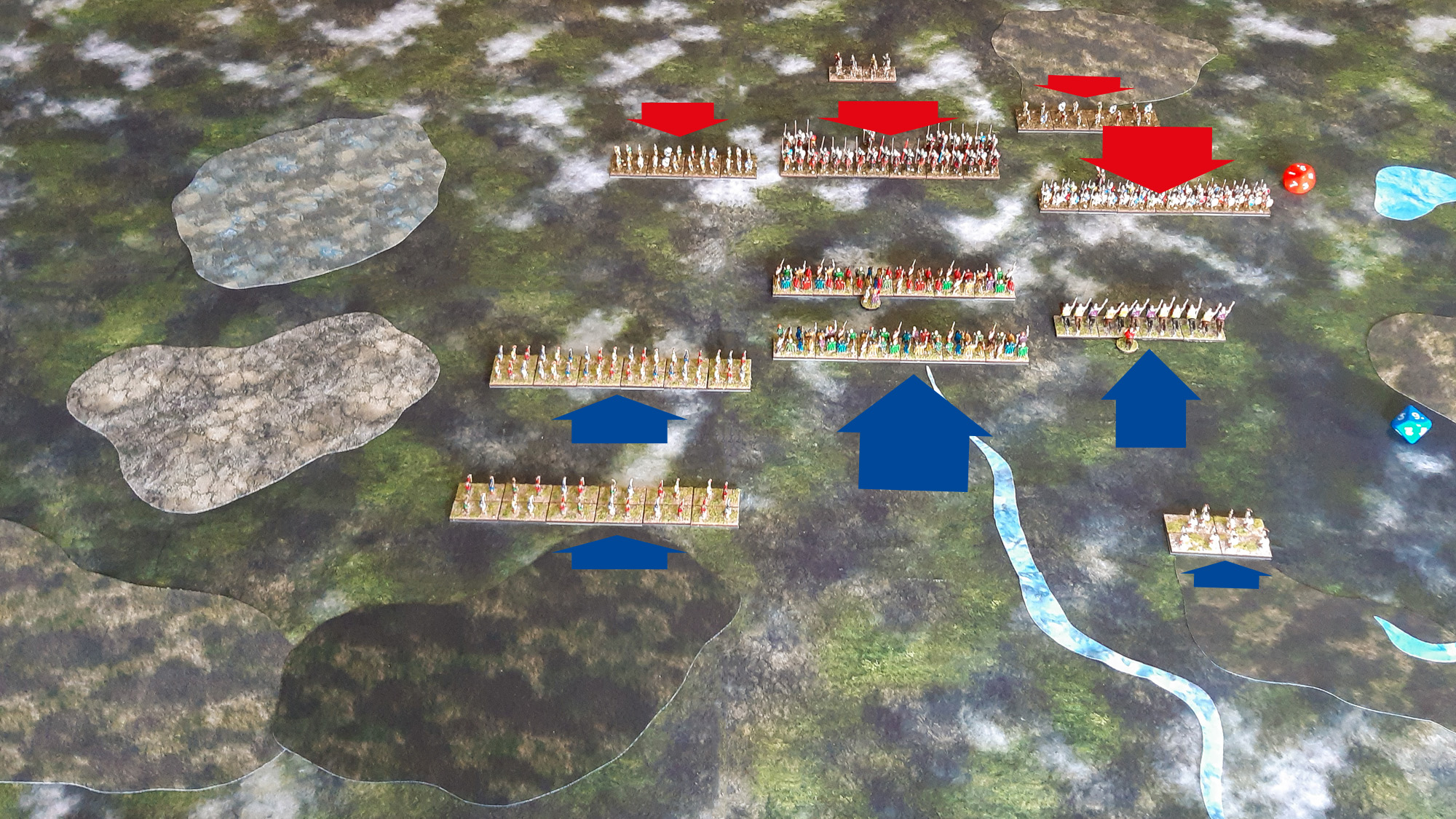 Das Terrain wird bei "Solo Age of Hannibal" nach einem Zufallsprinzip ausgewählt, wobei die primäre topografische Region vorab festgelegt werden kann. In diesem Fall wurde das Schlachtfeld von ausgedehnten und dichten Wäldern sowie vereinzelten Wasserhindernissen beherrscht, wodurch der Gefechtsraum auf ein schmales zentrales Areal begrenzt wurde. Die Aufstellung der Heere erfolgt bei "Solo Age of Hannibal" mittels zufällig gezogener Doktrinkarten, welche die taktische Disposition der Formationen definieren, wobei die Gliederung der Armeen in die verschiedenen Formationen (z.B. linker Flügel, Zentrum, rechter Flügel für eine dreigliedrige Armee) ebenfalls zufällig bestimmt werden kann (aber nicht muss). Im vorliegenden Fall habe ich die Formationen anhand einer von mir erstellten Aufstellungstabelle ausgewürfelt.