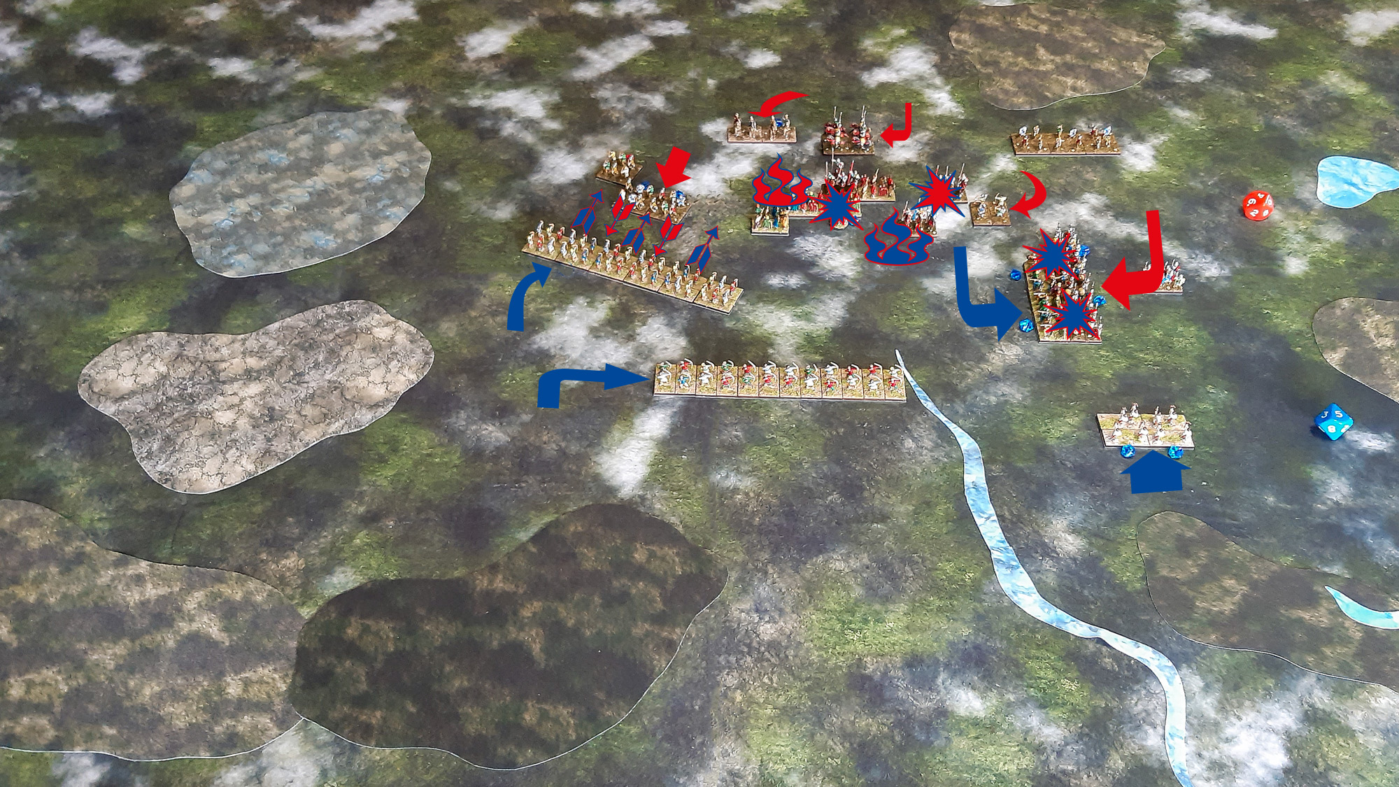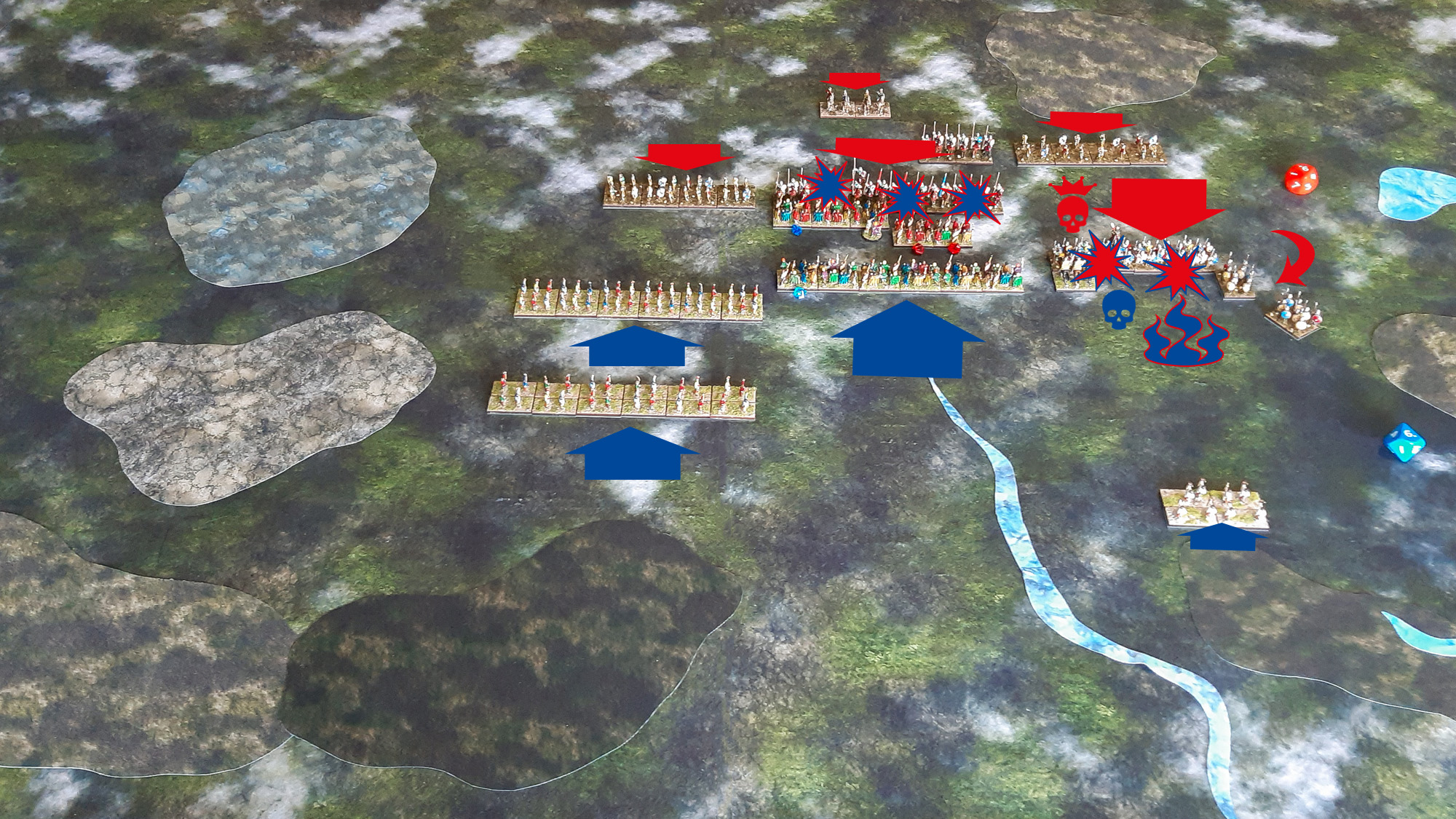 Am rechten Gefechtsrand erwiesen sich die Karolinger ihren Kontrahenten klar überlegen: Die Speerträger des fränkischen Aufgebots konnten die sächsischen Berittenen überraschend deutlich schlagen, wobei den Karolingern zugute kam, dass die Schwertkämpfer ganz außen die Reiter überlappen und einkesseln konnten. Bereits in der initialen Phase dieser Kämpfe wurde der hier stationierte Befehlshaber der Sachsen tödlich verletzt (blauer Totenkopf auf der Abbildung), als die Einheit, die er im Kampf unterstützte, vernichtet wurde (Wurf von 1-2 auf der General's Fate Table: "Killed!"). Der rechte Sektor war kein guter Ort für Generäle - denn schon kurze Zeit darauf erlitt der große Karl ein zwar nicht ganz so schweres, aber auch verheerendes Schicksal (roter Totenkopf), als die Einheit, mit der er kämpfte, geschlagen und er selbst gefangen genommen wurde (Wurf von 3 auf der General's Fate Table: "Captured!"). Dies ist jenes Ereignis, über welches die karolingischen Chronisten beschämt schwiegen. Beide Generalverluste führten in beiden Heeren zu sofortigem Moralverlust von je einem Punkt.