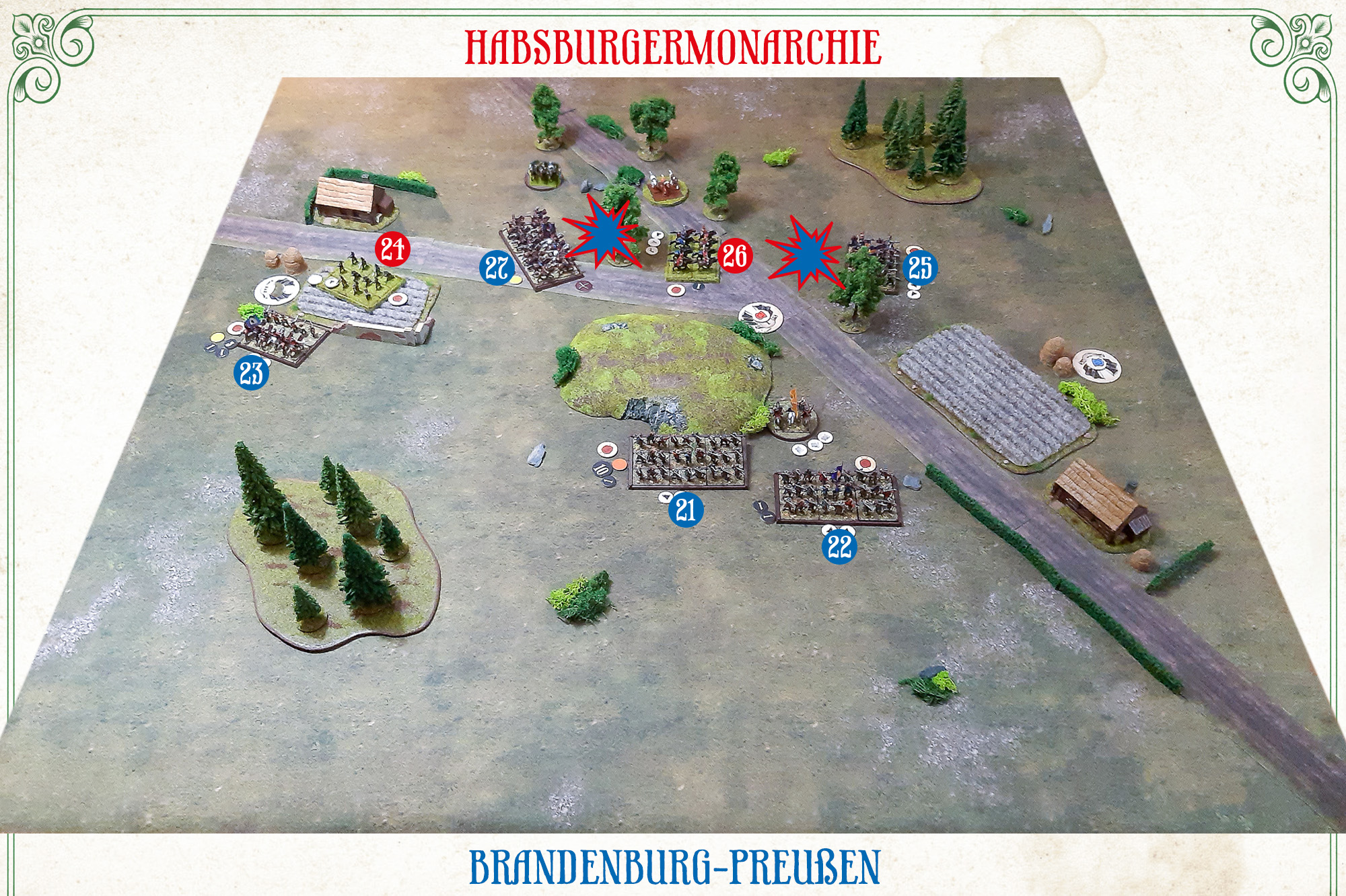 Die schwer angeschlagenen, aber noch einsatzfähigen Musketiere der Brandenburger mussten sich vom Hügel zurückziehen (21). Sie waren kurz davor, zu kollabieren, aber noch standen sie - und ihre neue Position am Fuß des Hügels gewährte ihnen zumindest Deckung vor dem andauernden Beschuss durch die Kroaten-Kavallerie. Das in der Reserve gehaltene Musketier-Bataillon erhielt nun den Marschbefehl, um die Linie zu stabilisieren und eine neue Feuerstellung einzunehmen (22).